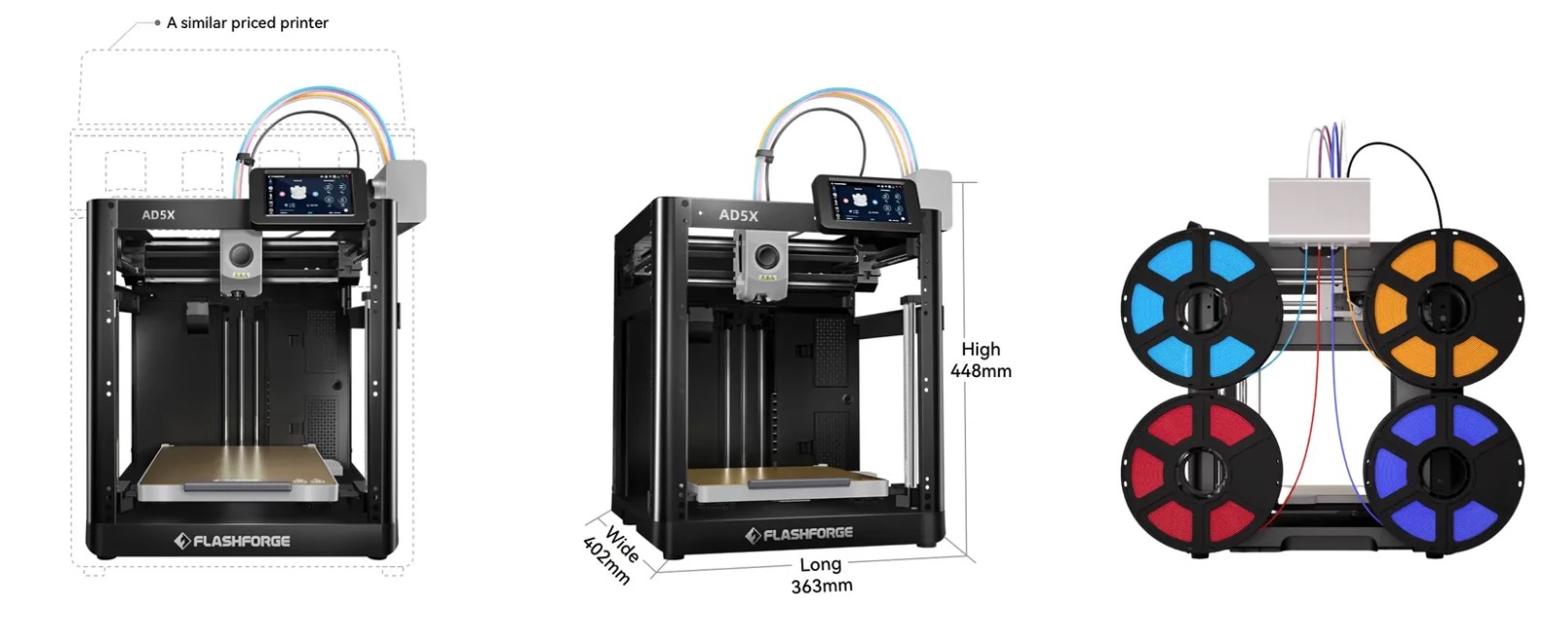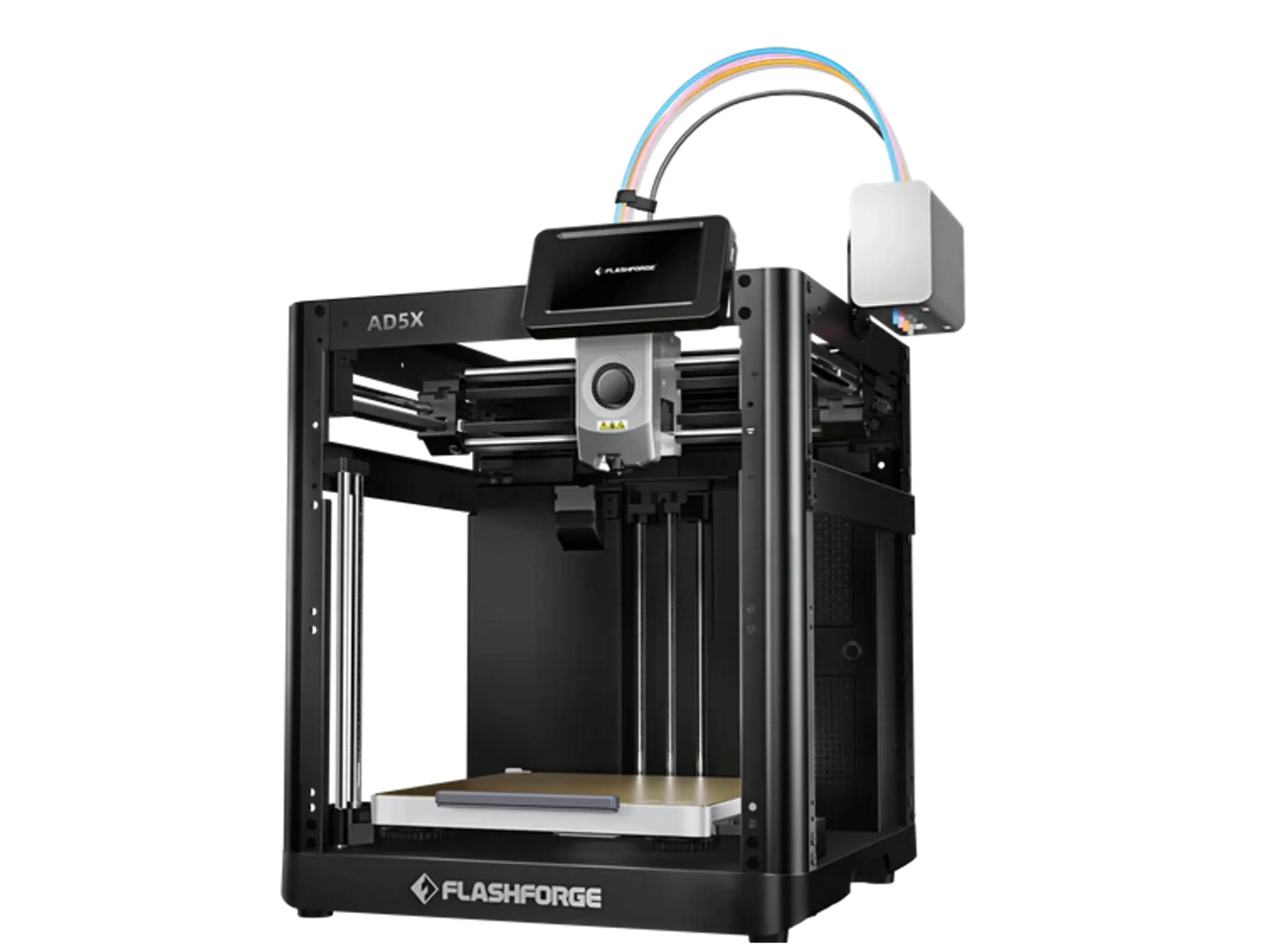 Der Flashforge AD5X ist ein neuer und ab sofort erhältlicher 3D-Drucker. Dabei unterstützt dieser den Druck mit mehreren Filamenten. Das Smart Multi-Color Filament Module befindet sich nicht auf dem Drucker, stattdessen werden die bis zu vier Filamente an der Seite des Druckers befestigt beziehungsweise eingehängt. Da nur ein Druckkopf vorhanden ist, wird wie üblich dann das Filament geschnitten und mit dem nächsten Filament weitergearbeitet. Es lassen sich nicht nur verschiedene Filamenttypen oder auch Farben drucken, stattdessen können auch gleich zwei identische Filamente genutzt werden - ist die erste Rolle aufgebraucht, wird automatisch zur zweiten Spule gewechselt. Die Filamente können nicht temperiert oder getrocknet werden.
