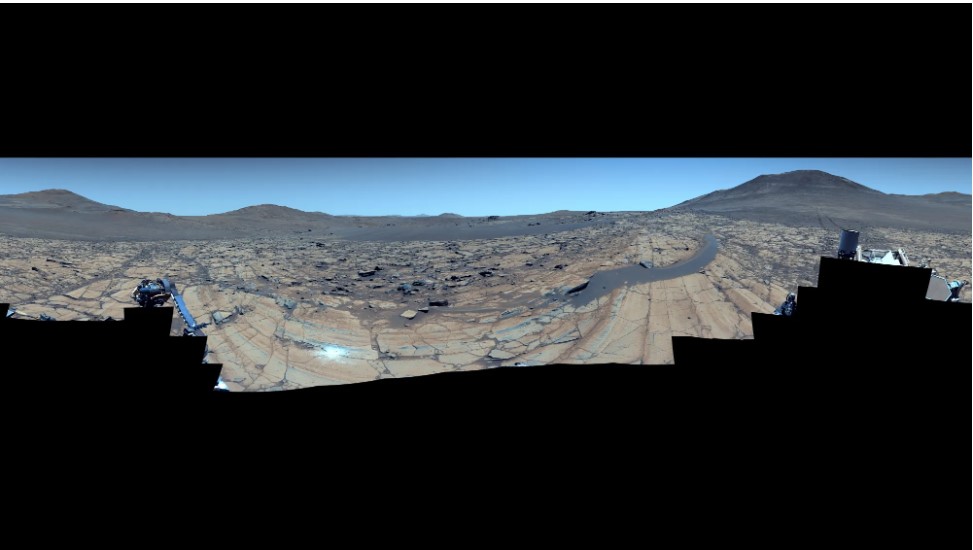 Ein weiteres Detail ist ein Band, das sich knapp hinter der Mitte des Mosaiks von einer Seite zur anderen zieht. Es trennt die helleren Gesteine, die näher am Rover liegen, von den dunkleren Gesteinen, die weiter entfernt zu sehen sind. Die helleren Gesteine sind reich an Olivin, die dunkleren gelten als deutlich ältere, tonreiche Gesteine.