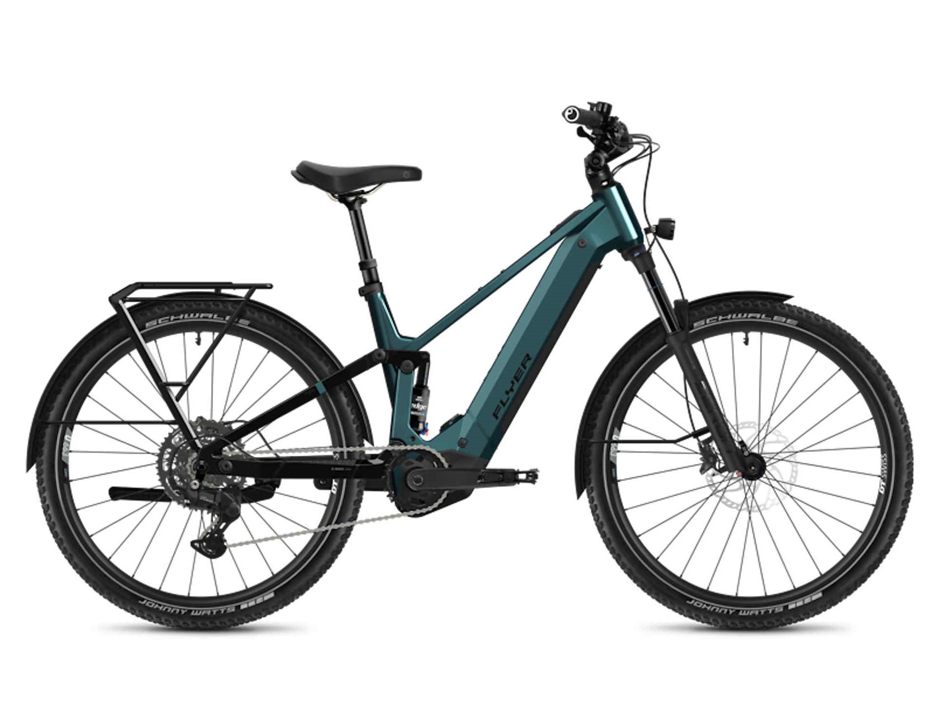 Flyer hat mit dem Goroc X 2.10 ein neues E-Bike mit einer starken Ausstattung angekündigt, welches sich sowohl etwa für den täglichen Arbeitsweg als auch Ausflüge ins Gelände und das Bikepacking eignen dürfte. Es handelt sich sozusagen um ein SUV-E-Bike, also um ein Fahrrad mit Mountainbike-Anleihen, welches aber zudem die Ausstattung eines Trekking-E-Bikes mitbringt. Das Goroc X 2.10 ist vollgefedert und bringt somit sowohl Federgabel als auch Dämpfer mit und dürfte sich im Alltag durch die Anbauteile gut schlagen. So ist ein Hinterbauständer ebenso vorhanden, wie ein Gepäckträger. Dazu kommen noch Schutzbleche und eine Beleuchtung. Es kommt eine Aion35 Evo-Gabel zum Einsatz, der Edge X-Dämpfer stammt von SR Suntour. Die Scheinwerfer sollen 100 Lux und ein automatisches LED-Tagfahrlicht bieten, der verbaute Gepäckträger ist zum MonkeyLoad-System kompatibel und bringt eine Federklappe mit - das ist keine Selbstverständlichkeit mehr. Je nach gewählter Größenversion wiegt das System 32 Kilogramm, das zulässige Gesamtgewicht wird mit 150 Kilogramm angegeben. Der Gepäckträger kann 25 Kilogramm tragen.