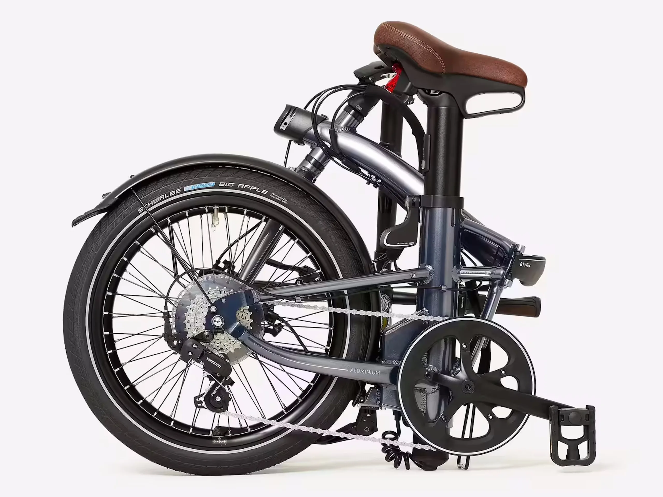 Das Btwin Fold 900 wird mit einem speziellen Haltesystem beworben. Dieses hält das Elektrofahrrad im zusammengeklappten Zustand zusammen. Das hat einen großen Vorteil: Da die beiden Räder parallel gehalten werden, kann das Fahrrad Herstellerangaben zufolge im zusammengeklappten Zustand einfach geschoben werden, was etwa auf Bahnhöfen sinnvoll sein kann. Es kommen 20 Zoll große und 2 Zoll breite Big Apple-Reifen von Schwalbe zum Einsatz, damit dürfte sich das Fahrrad bei vielen Verkehrsunternehmen im komprimierten Zustand kostenfrei als Gepäck mitnehmen lassen.