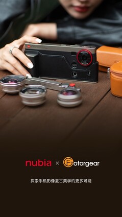 Auf drei Teaser-Bildern zeigt Nubia eine Reihe von Wechselobjektiven, die vor die 35 mm Hauptkamera geschraubt werden können, um deren Brennweite zu verändern. In Zusammenarbeit mit Fotorgear hat Nubia zumindest fünf dieser Aufsteck-Objektive entwickelt, inklusive einem Fischaugen-Objektiv, einem Makro-Objektiv, einem 139 mm Tele-Objektiv und einem 400 mm Tele-Objektiv.