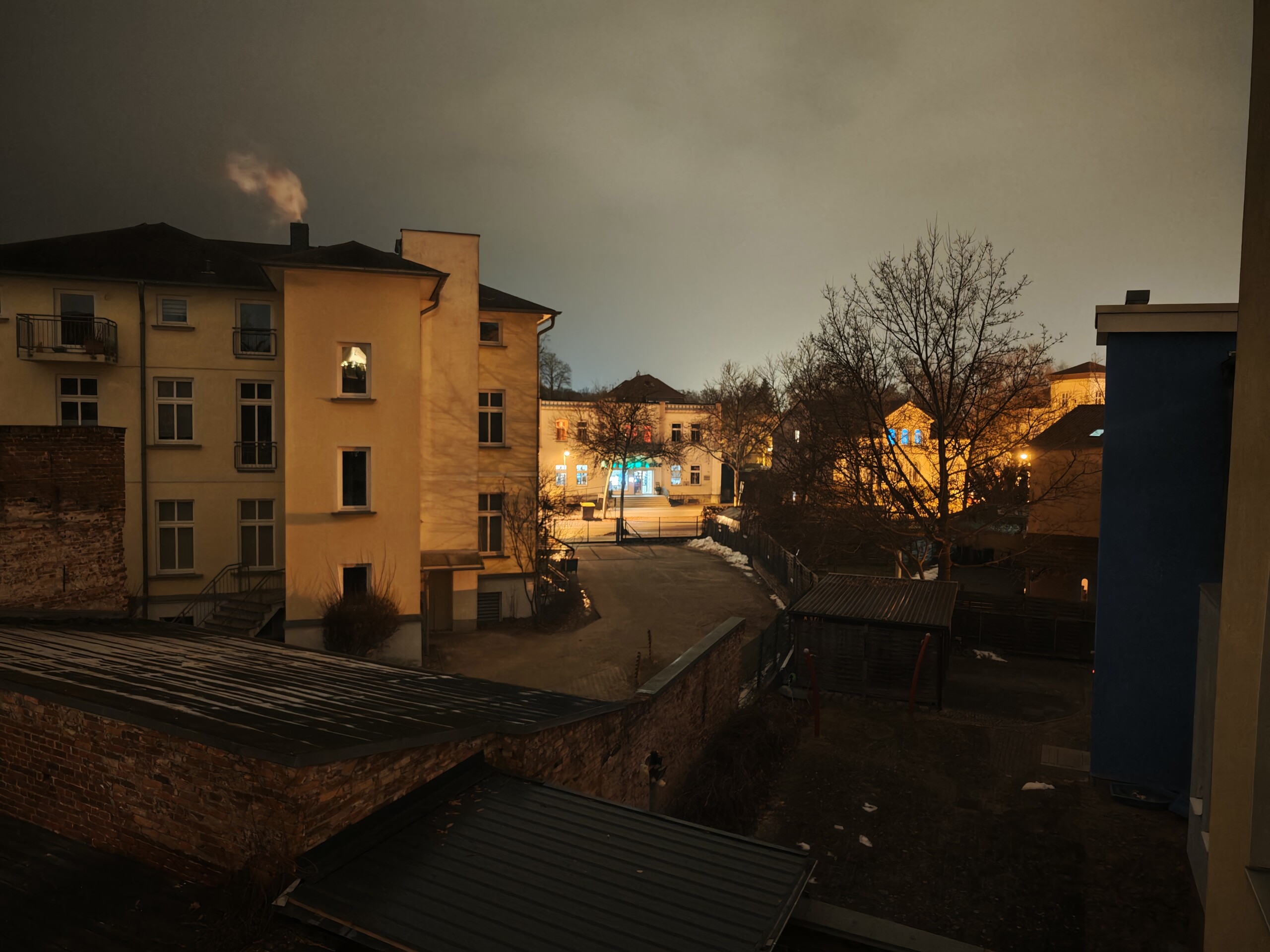 Bei Nacht wird der Klassenunterschied noch deutlicher. Für unser Testmotiv gelingt dem Xiaomi-Flagship ein gut balanciertes Foto vielen Details ohne dabei die Beleuchtung innerhalb der Häuser zu überbelichten. Ganz anders präsentiert sich das Galaxy S25 Ultra, welches sichtbar körnt und das Motiv stark verrauscht wiedergibt.