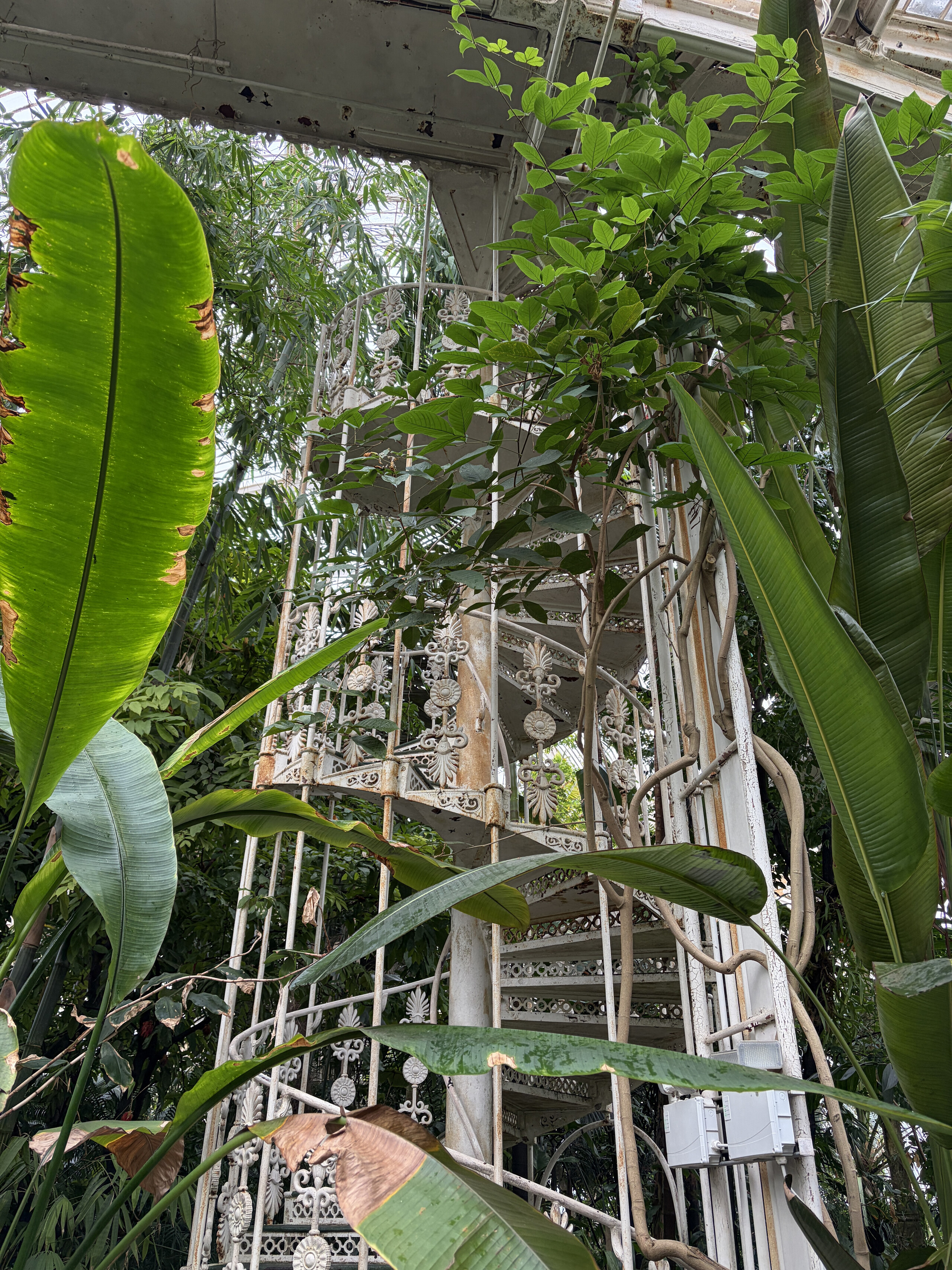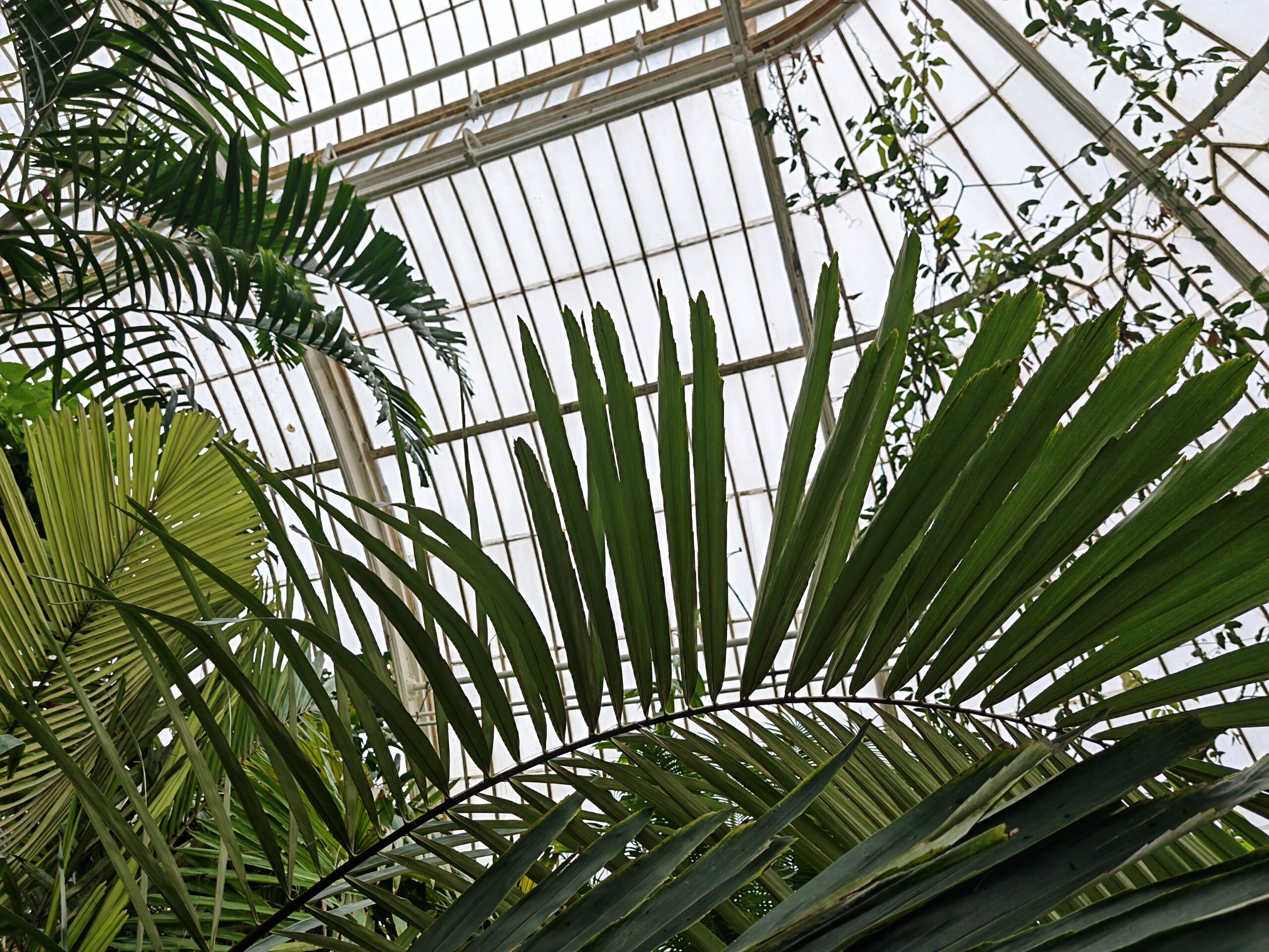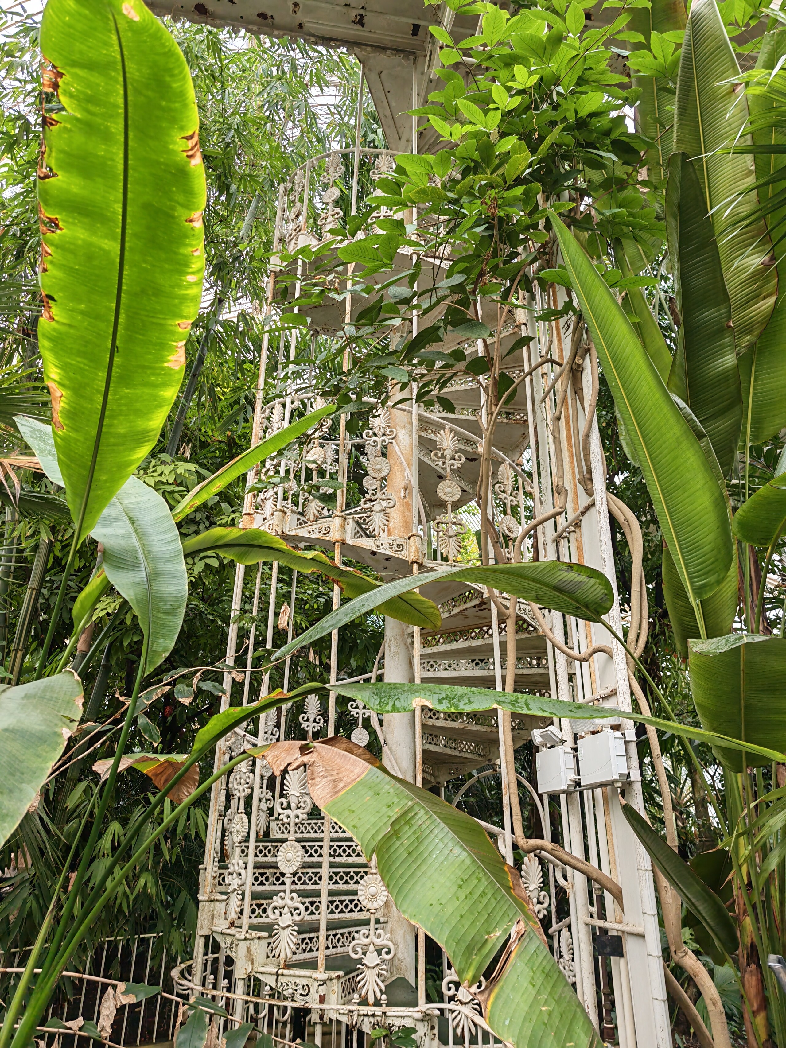Im Palmenhaus kann man über eiserne Stufen auch einen Umgang erreichen, welcher einen Blick von oben auf die üppige tropische Pflanzenwelt erlaubt. Kontrastreicher wirkt auch hier das Foto aus dem Honor-Phone, bei der Detailvielfalt und Schärfe gewinnt aber wieder das iPhone.