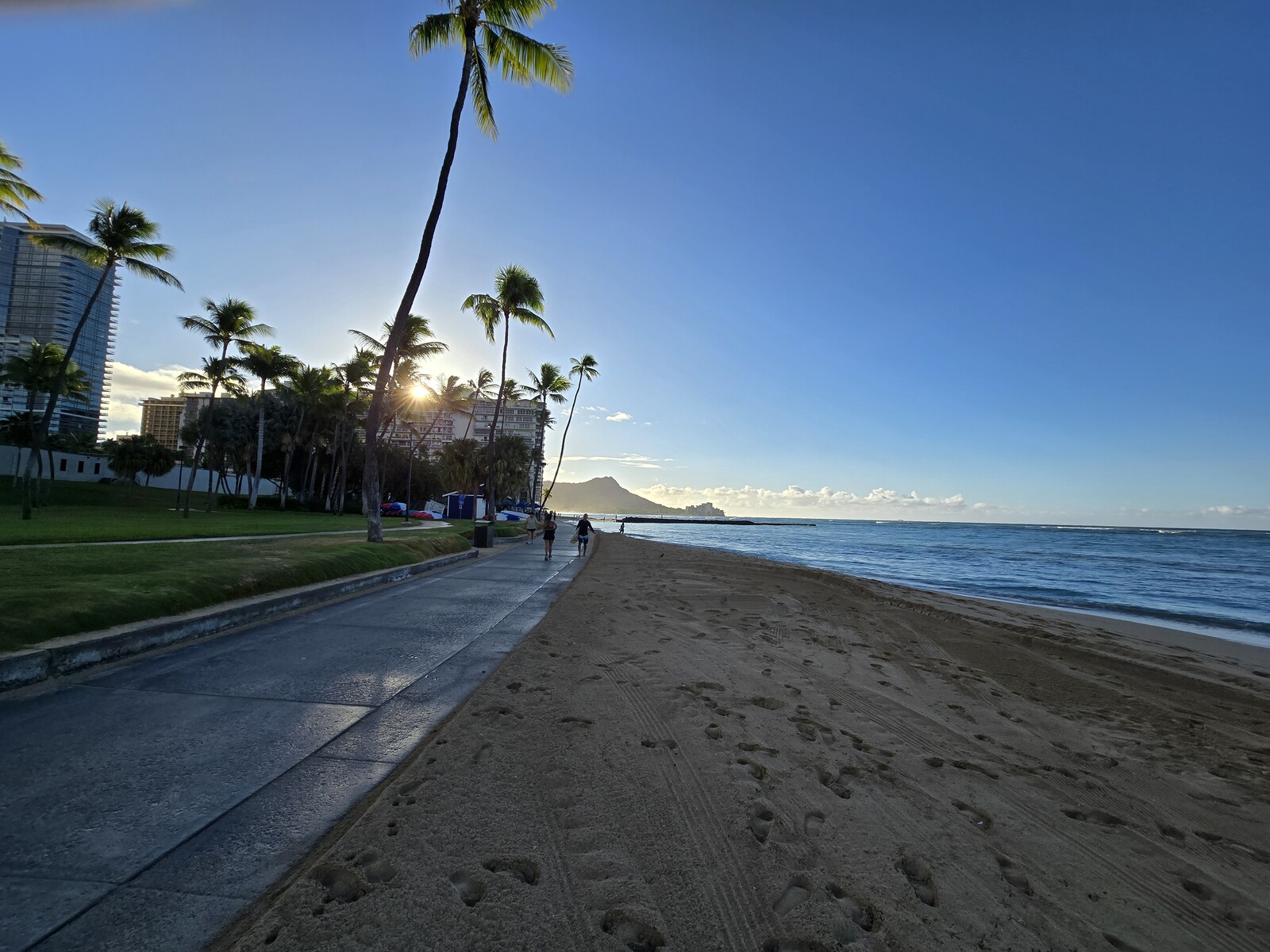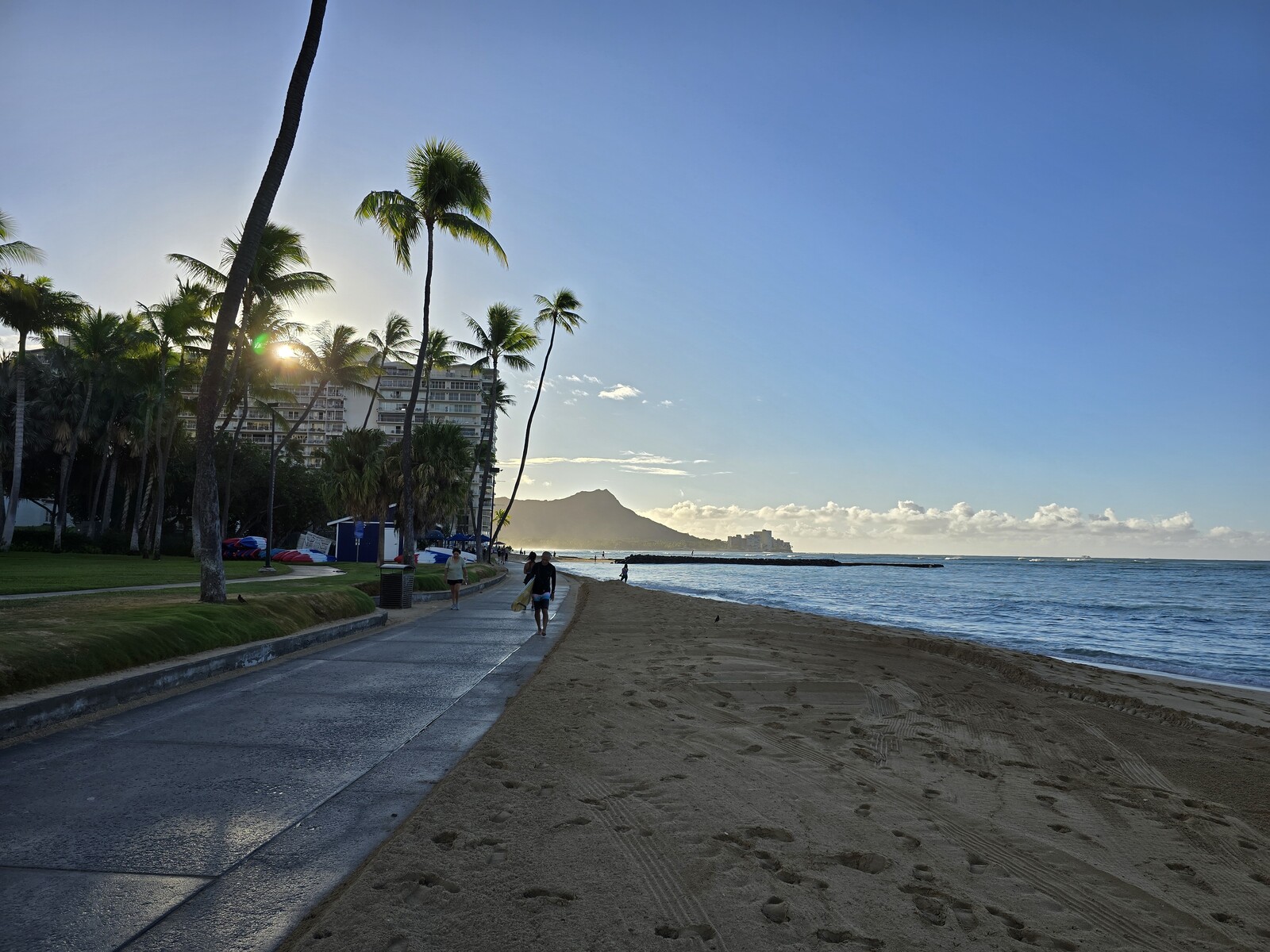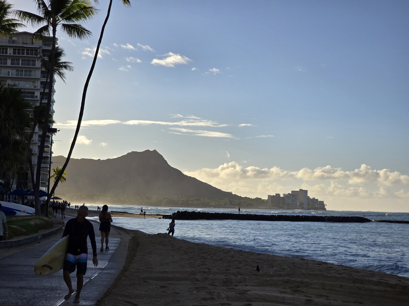 Endlich stehen wir am weltberühmten Strand von Waikiki und können dort sogar den Sonnenaufgang noch weiter genießen. Um die Zoom-Qualitäten der beiden Phones zu testen, haben wir uns den Diamond Head-Krater und die davorliegenden Hotelbauten als Ziel ausgesucht.