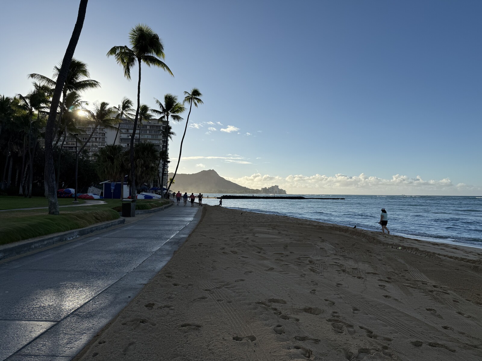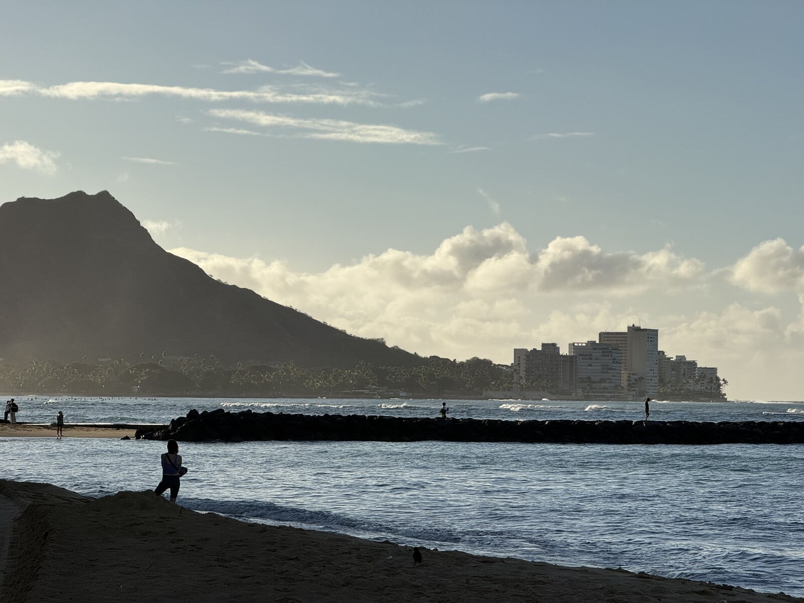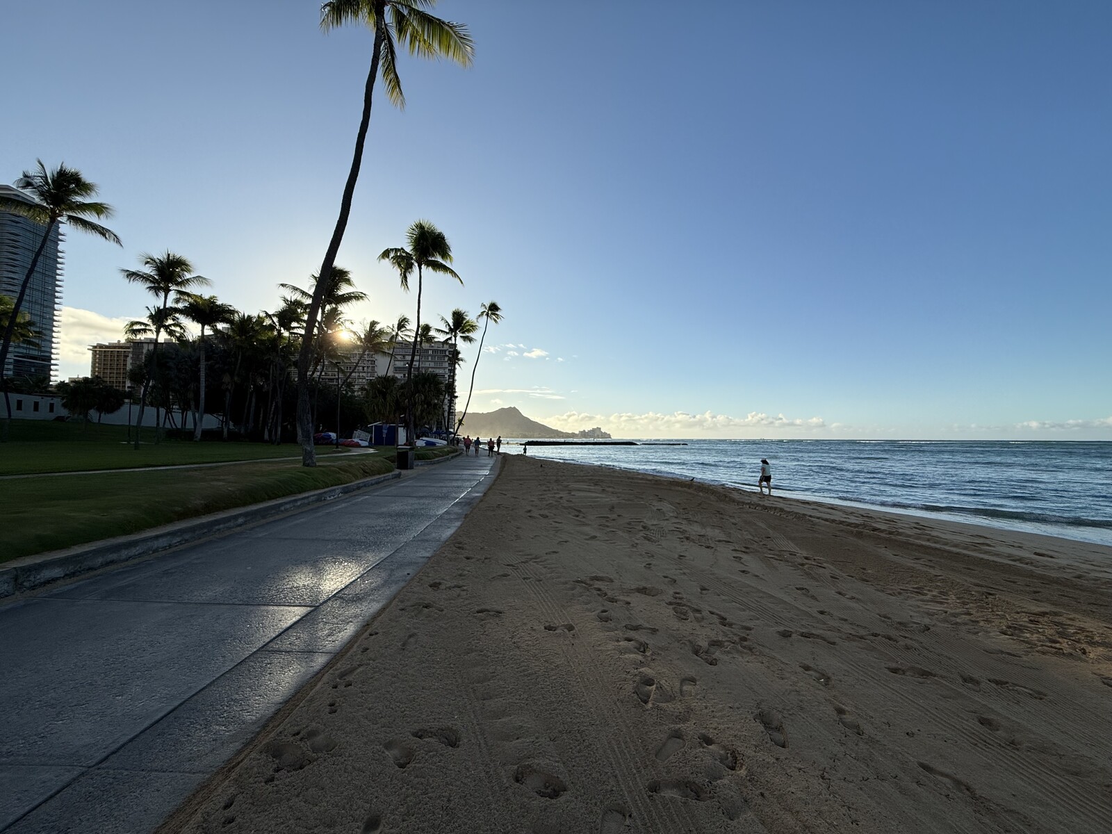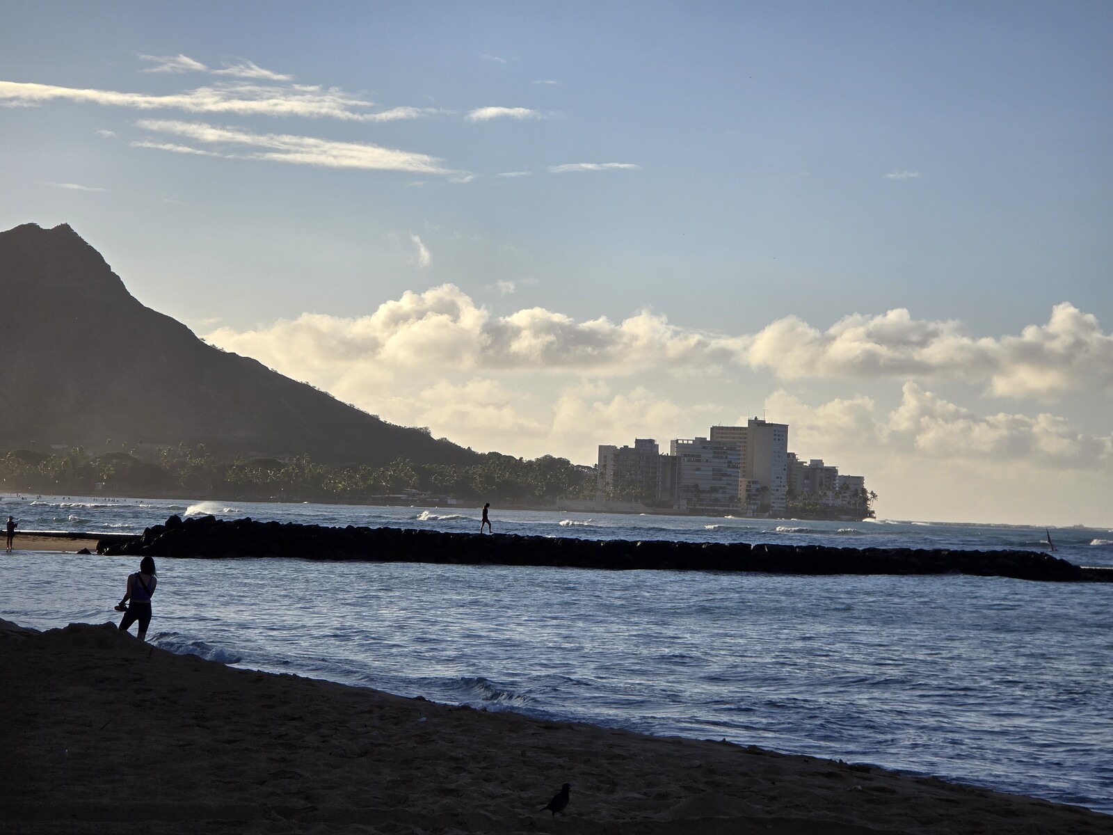 Endlich stehen wir am weltberühmten Strand von Waikiki und können dort sogar den Sonnenaufgang noch weiter genießen. Um die Zoom-Qualitäten der beiden Phones zu testen, haben wir uns den Diamond Head-Krater und die davorliegenden Hotelbauten als Ziel ausgesucht.