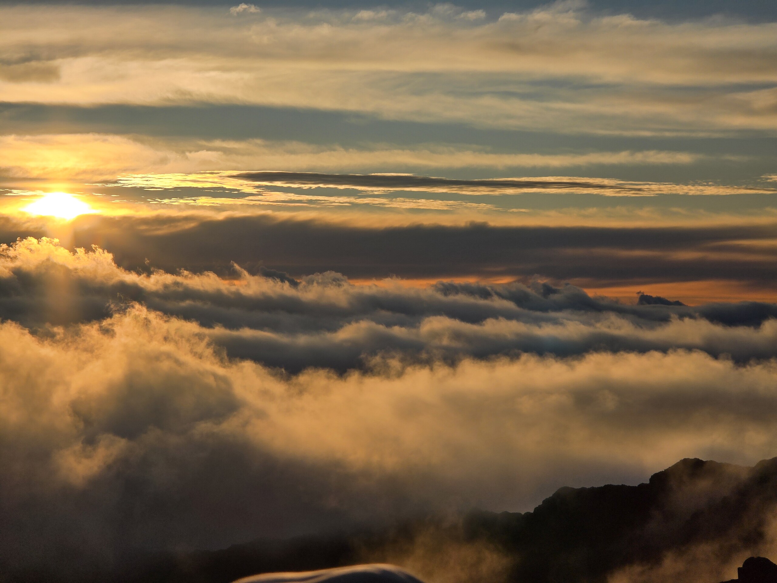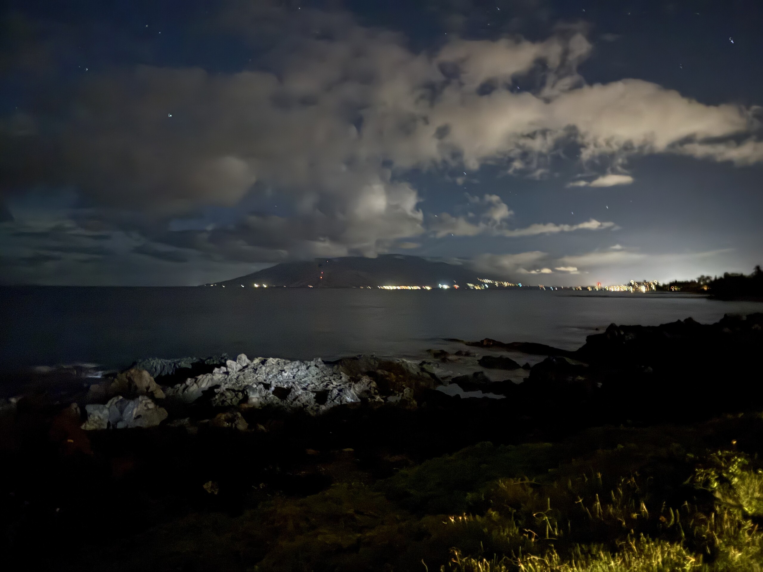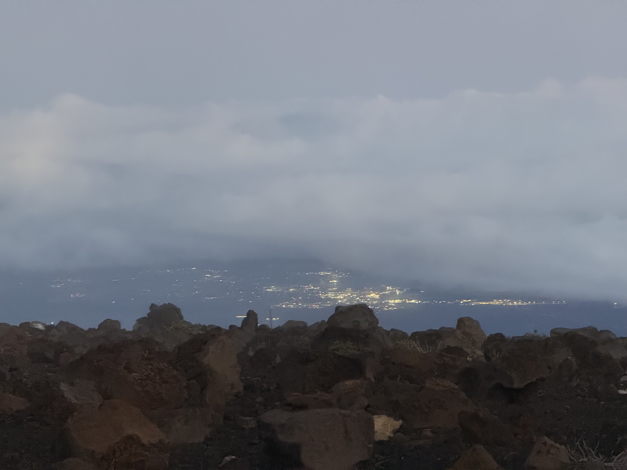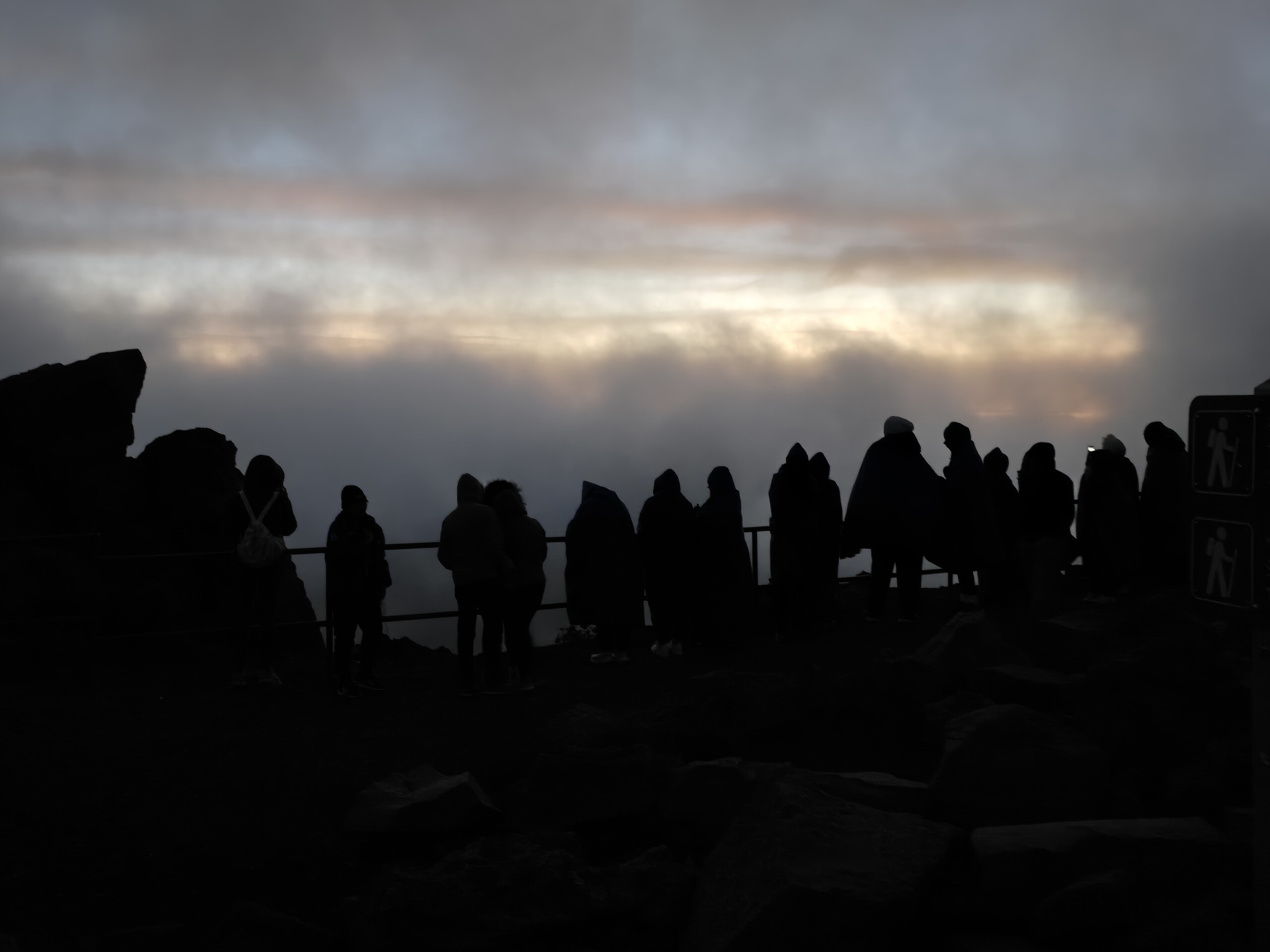4 °C sind eine ungewohnte Temperatur auf Hawaii, aber in dieser Höhe und so früh am Tag durchaus möglich. Viele Menschen warten schon auf die Sonne, aktuell sind nur helle Sterne am Himmel zu sehen, der Horizont leuchtet aber schon. Wir machen ein stimmungsvolles Bild der wartenden Masse, dabei gelingt dem iPhone allerdings nur eine etwas unscharfe Aufnahme, während das Samsung-Foto körnig, aber deutlich schärfer wirkt.