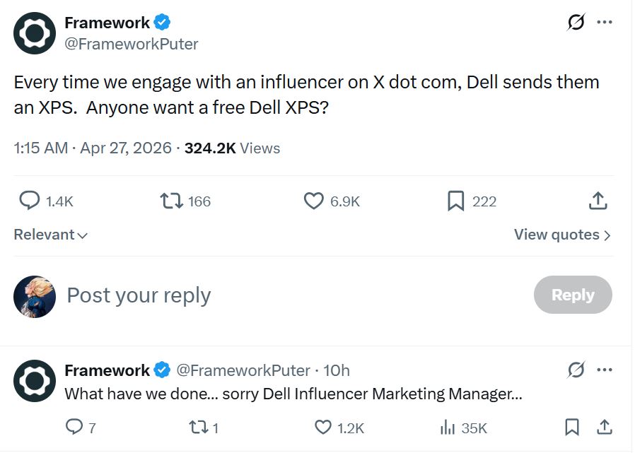 Entsprechend scheinen etablierte Laptop-Hersteller Framework inzwischen ernst zu nehmen. Framework behauptet: "Jedes Mal, wenn wir auf X mit Influencern interagieren, schickt Dell ihnen ein XPS". Der Beitrag hat bereits eine ordentliche Reichweite erzielt, zum Zeitpunkt der Veröffentlichung lag er bei über 320.000 Aufrufen. Das hat viele dazu veranlasst, Framework scherzhaft um Interaktionen zu bitten, in der Hoffnung, von Dell ein XPS zu erhalten.