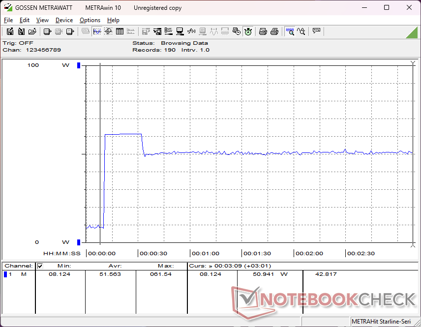 Im Leerlauf auf dem Desktop liegt der Verbrauch zwischen 2 W und 6 W, was niedriger ist als bei der Core-P-Konfiguration des letzten Jahres, selbst bei dem neuen 2,8K 120 Hz-Display. Die höhere Effizienz der Meteor Lake-H CPU gleicht den höheren Verbrauch des Displays aus.