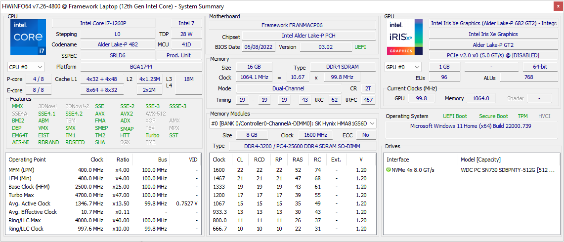 | Framework Laptop 13.5 12th Gen Intel i7-1260P, Iris Xe G7 96EUs, WDC PC SN730 SDBPNTY-512G, IPS, 2256x1504, 13.5" | Framework Laptop 13.5 i7-1165G7, Iris Xe G7 96EUs, Western Digital WD_BLACK SN850 WDS100T1X0E, IPS, 2256x1504, 13.5" | Lenovo ThinkPad X1 Titanium Yoga G1 20QB0016GE i5-1140G7, Iris Xe G7 80EUs, Lenovo UMIS RPJTJ256MEE1OWX, IPS LED, 2256x1504, 13.5" | HP EliteBook Folio 13.5-3G2L2EA SD 8cx Gen 2 5G, Adreno 680, Toshiba XG6 KXG60ZNV512G, IPS, 1920x1280, 13.5" | Microsoft Surface Laptop 4 13 Ryzen 5 R5 4680U, Vega 7, Samsung PM991 MZ9LQ256HBJQ, IPS, 2256x1504, 13.5" | HP Spectre x360 14-ea0378ng i7-1165G7, Iris Xe G7 96EUs, Intel Optane Memory H10 with Solid State Storage 32GB + 1TB HBRPEKNX0203AH(L/H), OLED, 3000x2000, 13.5" | |