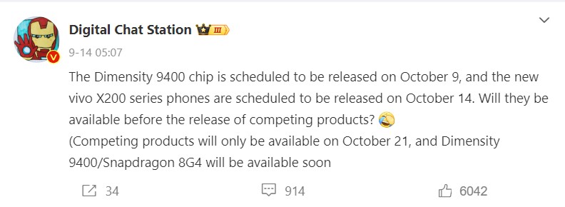 Laut Digital Chat Station wird Mediatek seinen Dimensity 9400 offiziell bereits am 9. Oktober vorstellen, womit dem Vivo X200 Launch am 14. Oktober also nichts mehr im Weg stehen soll.