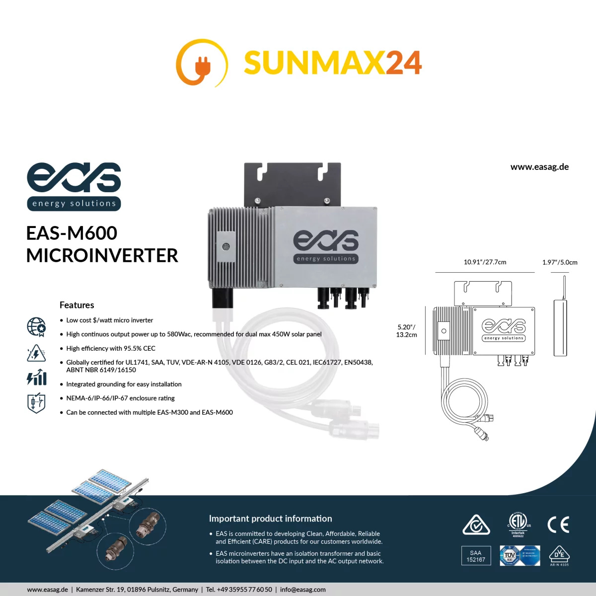 Hinter dem Namen EAS steht der Hersteller NEP (Northern Electric Power), dessen Solarprodukte unter verschiedenen Labels auf dem Markt erhältlich sind. Das in den USA gegründete Unternehmen hat es sich nach eigenen Angaben zur Aufgabe gemacht, Technologien für saubere Energie zu entwickeln und ist seit rund zehn Jahren auf die Herstellung von Solarprodukten wie effizienten Wechselrichtern spezialisiert.