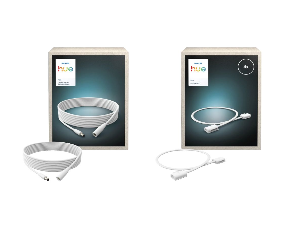 Das eine Hue Flux-Verbindungsstück ist I-förmig, das andere L-förmig. Beide dienen dazu, Flux-Leuchtstreifen miteinander zu verbinden und so eine größere Gesamtlänge zu erzielen. Das Flux I-Verbindungsstück ermöglicht es, zwei Leuchtstreifen über größere Entfernungen zu verbinden, wobei eine kleine Unterbrechung der Beleuchtung entsteht. Mit dem Flux-Verlängerungskabel können die Leuchten weiter entfernt von der Stromquelle positioniert werden. Die Flux-Befestigungsclips lassen sich zudem verwenden, um den Leuchtstreifen mithilfe der transparenten Clips an Wand oder Decke zu befestigen.