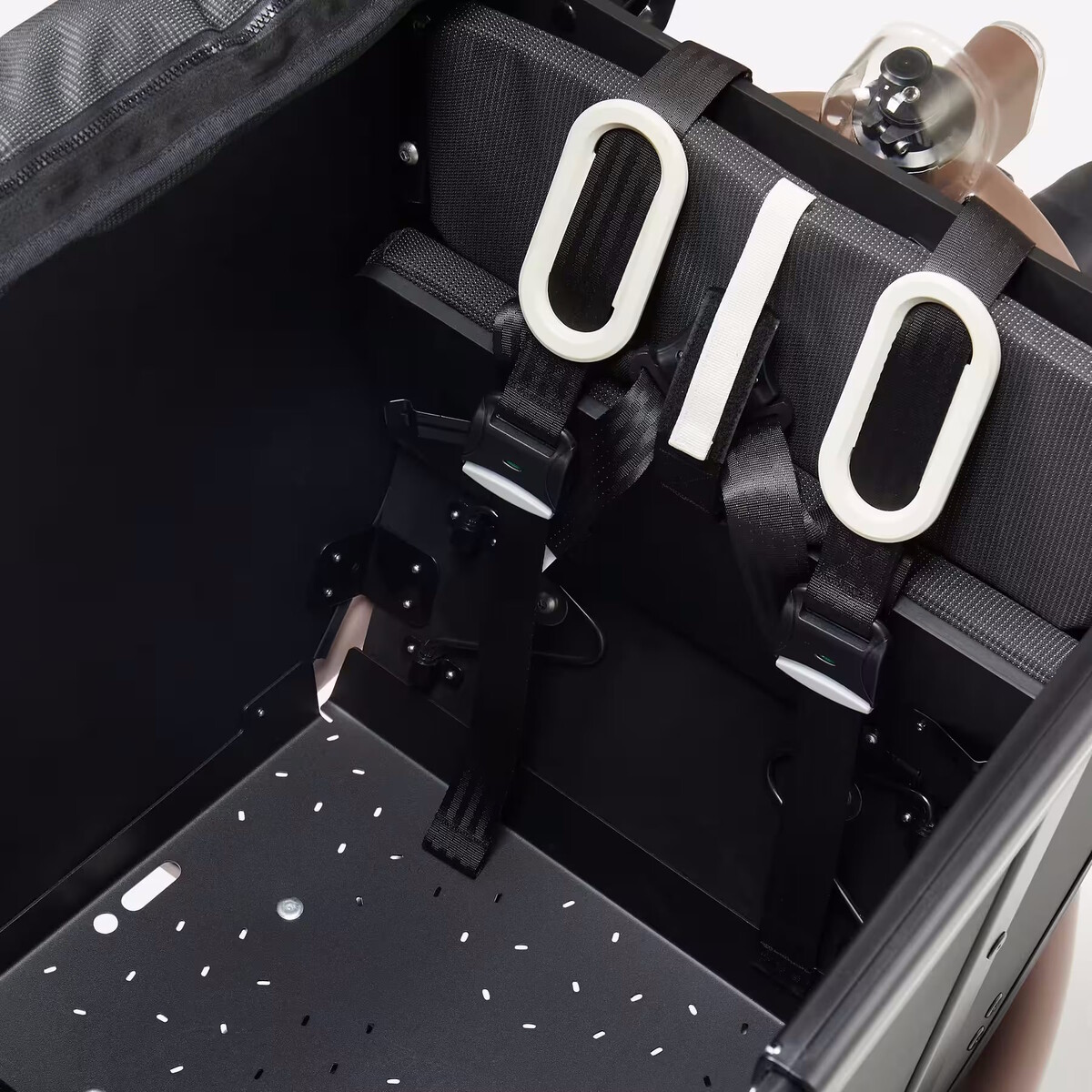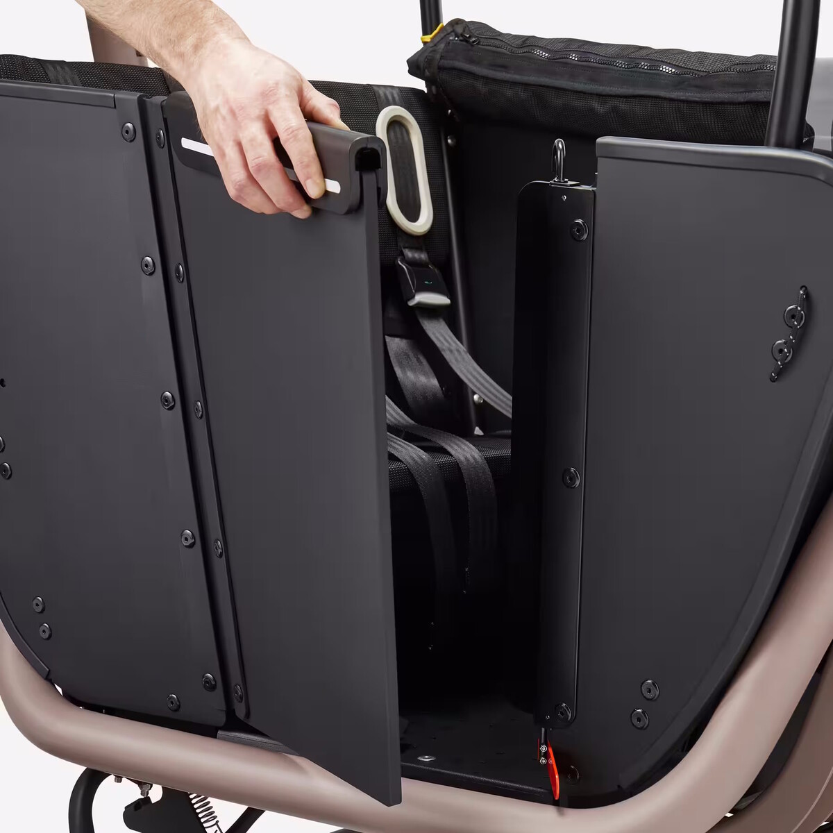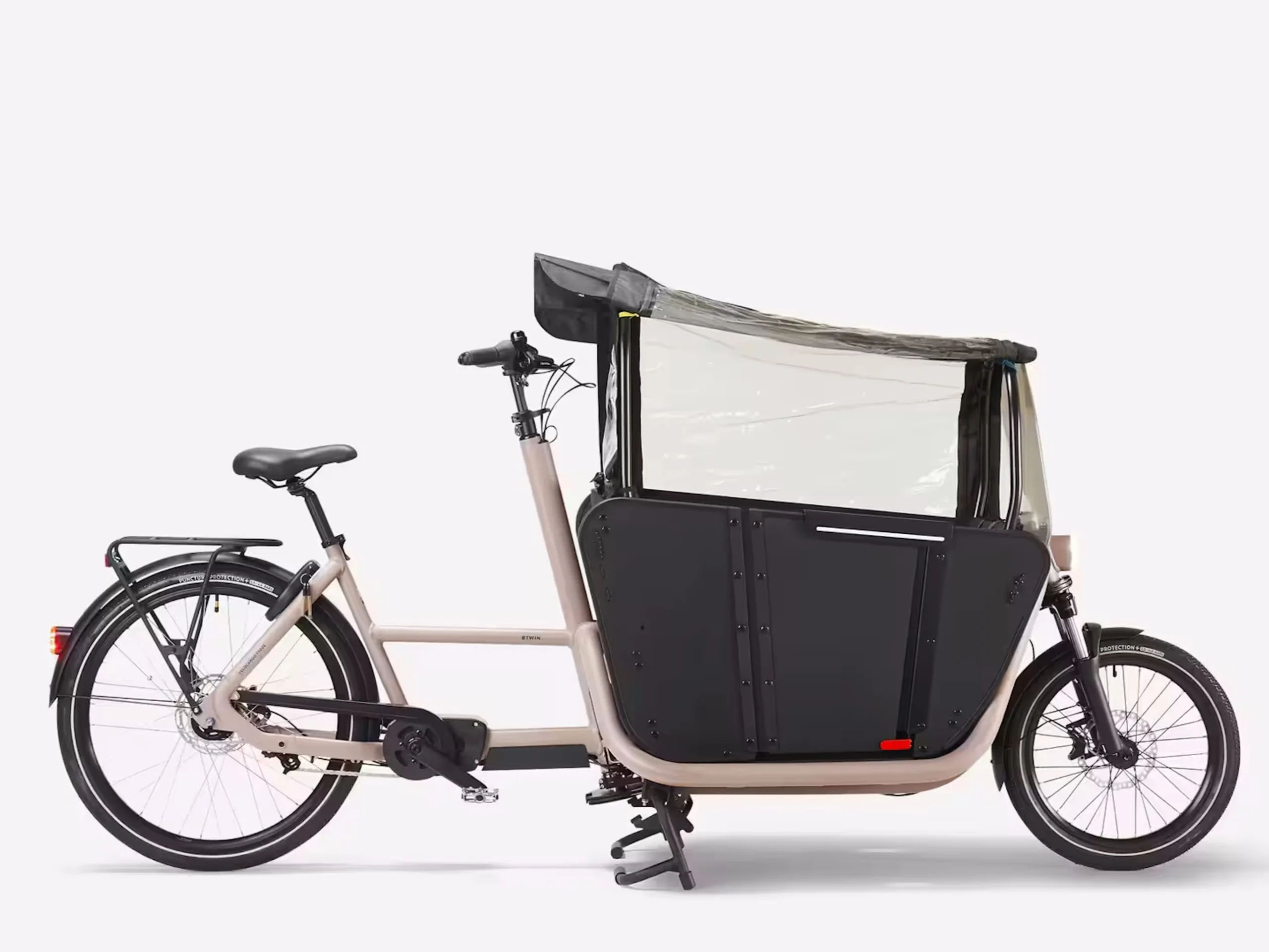 Es handelt sich um ein Lastenfahrrad mit Elektromotor und einem Frontkorb. Ein solcher Frontkorb hat gegenüber dem Transport etwa von Kindern auf einem Gepäckträger den Vorteil eines niedrigeren Schwerpunkts, daraus kann eine wesentlich höhere Fahrstabilität resultieren. Die Frontbox soll für Kinder ab 9 Monaten geeignet sein und bringt drei Sicherheitsgurte mit, die klappbare Bank ist dabei sogar mit Polstern ausgestattet. Kinder oder auch Gepäck können mit dem Regenverdeck gegen Nässe geschützt werden. Das Verdeck ist grundsätzlich fest montiert und lässt sich innerhalb von Sekunden aufschieben und wieder verstauen. Durch den hinteren Überstand werden auch die Hände des Fahrers vor Regen geschützt. Der Gepäckträger ist ebenfalls für einen Kindersitz geeignet.