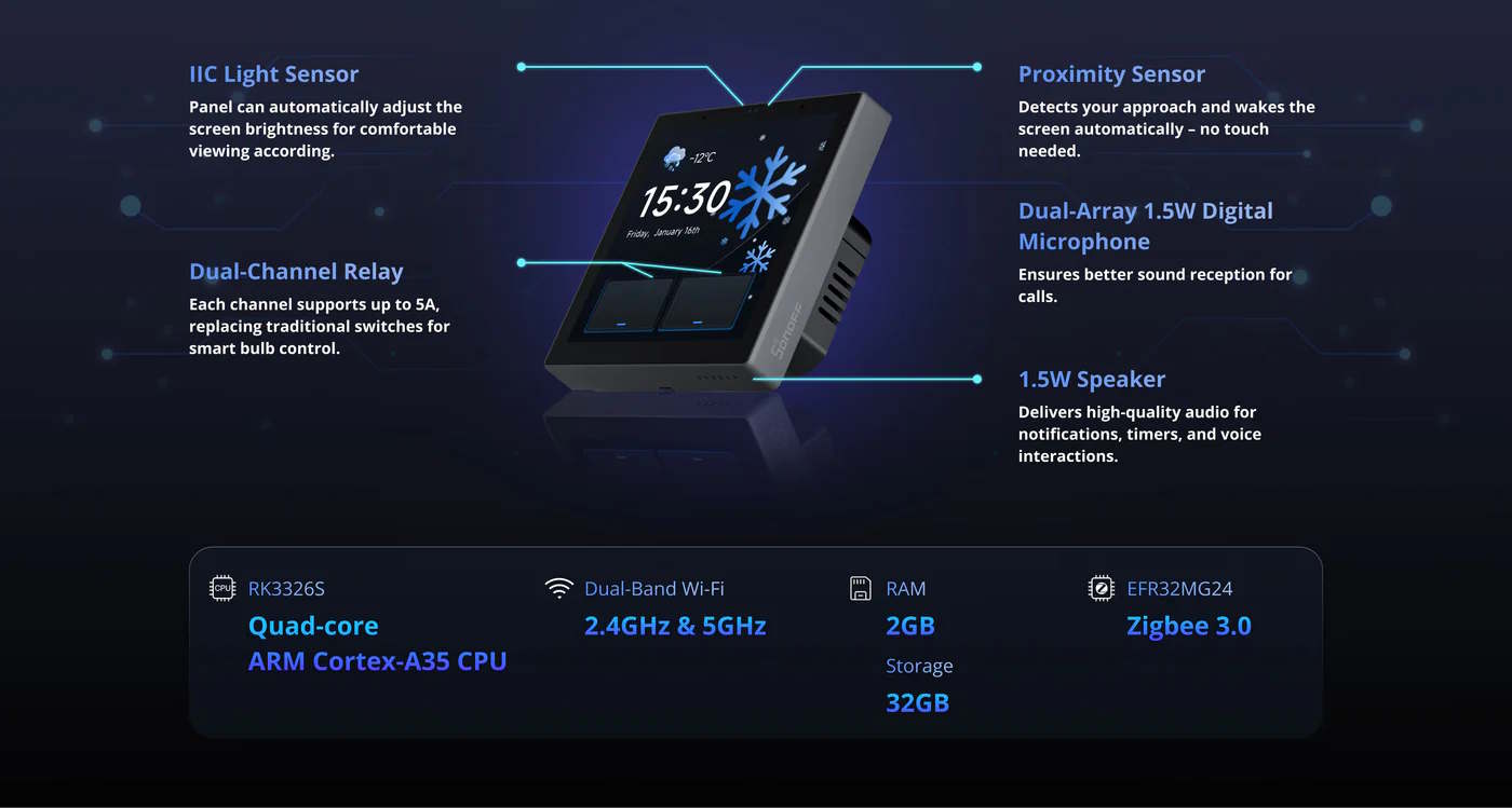 Verbaut sind unter anderem zwei Mikrofone, mit denen sich Sprachkommandos ausführen lassen. Als SoC kommt der RK3326-S zum Einsatz, welcher auf einen zwei Gigabyte großen Arbeitsspeicher und einen internen Speicher mit einer Kapazität von 32 Gigabyte zugreifen kann. Der 3,95 Zoll große Monitor löst mit 480 × 480 Pixeln auf, es handelt sich um einen Touchscreen. Dessen Helligkeit lässt sich auch mithilfe eines Helligkeitssensors steuern, damit dieser am Tag gut ablesbar ist und in der Nacht nicht stört. Der NSPanel Pro Gen2 kann erkennen, wenn eine Person vor dem Gerät steht. Ein Lautsprecher ist verbaut. Das Bild von Überwachungskameras soll sich anzeigen lassen. Bestellbar ist das Modell aktuell für einen Preis von rund 117 Euro, die Auslieferung soll erst im Juni erfolgen.