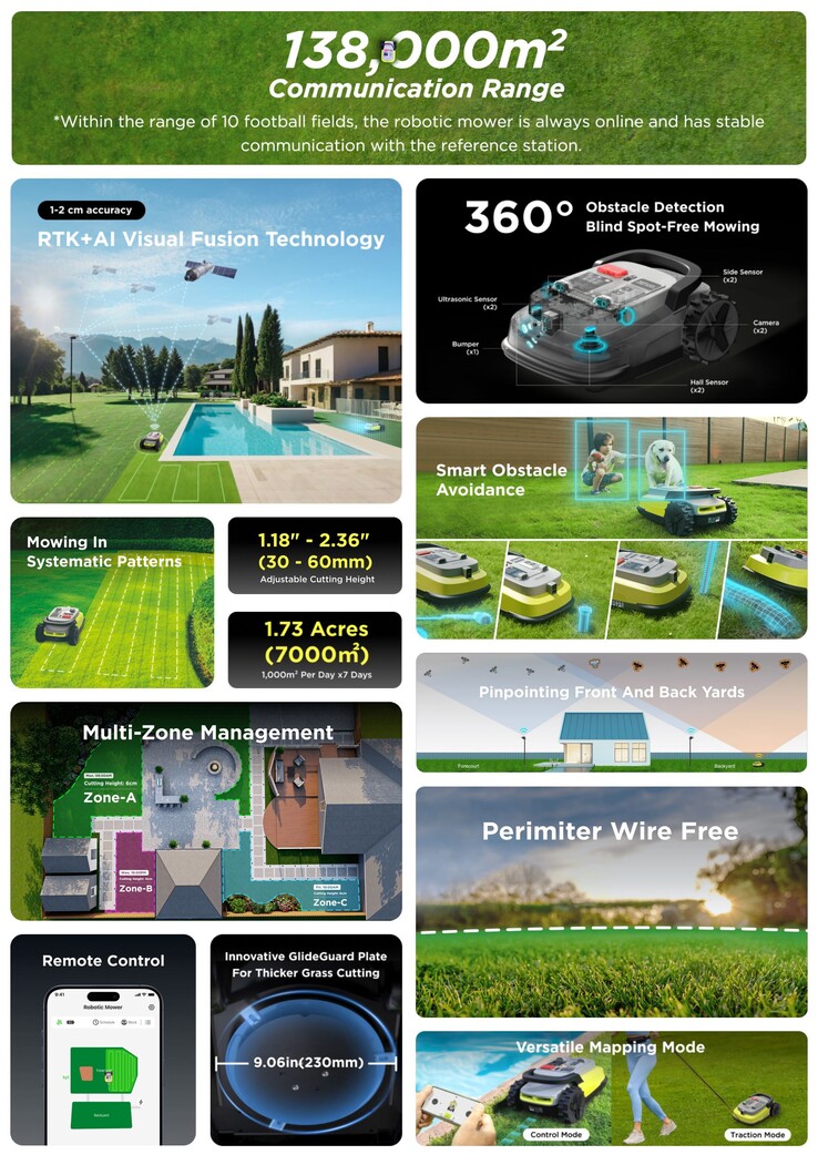 Wie alle modernen Mähroboter ohne Draht setzt auch der neue Ubhome M10 auf RTK. Hierbei verspricht der Hersteller mit bis zu zwei RTK-Referenzstationen die Abdeckung eines besonders großen Bereiches von maximal 138.000 Quadratmeter. Die Mähfläche gibt der Hersteller mit bis zu 7.000 Quadratmeter an, wobei geschönt von 1.000 Quadratmetern am Tag und einem Betrieb sieben Tage die Woche ausgegangen wird. Die Mähscheibe fällt 23 cm groß aus und kann in der Höhe zwischen 30 und 60 mm eingestellt werden.