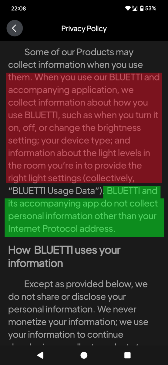 Die anhängige Datenschutzerklärung liest sich leicht paradox (s. Screenshot) und bezieht sich auf alle Bluetti-Produkte, ganz klar ist nicht, ob die App mehr als nur die IP erhebt. Eine Teilnahmeaufforderung an Promotion-E-Mails ploppt alle 30 Tage auf.