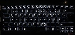 Dennoch lässt es sich nach einer Eingewöhnungsphase erstaunlich schnell und akkurat auf der spritzwassergeschützten, zweistufig beleuchteten Chiclet-Tastaur mit 15x15 mm messenden Tasten tippen. Sie besitzt zudem ein aufgeräumtes Layout, bei dem alle wichtigen Tasten ohne Doppelbelegung ausgeführt sind.