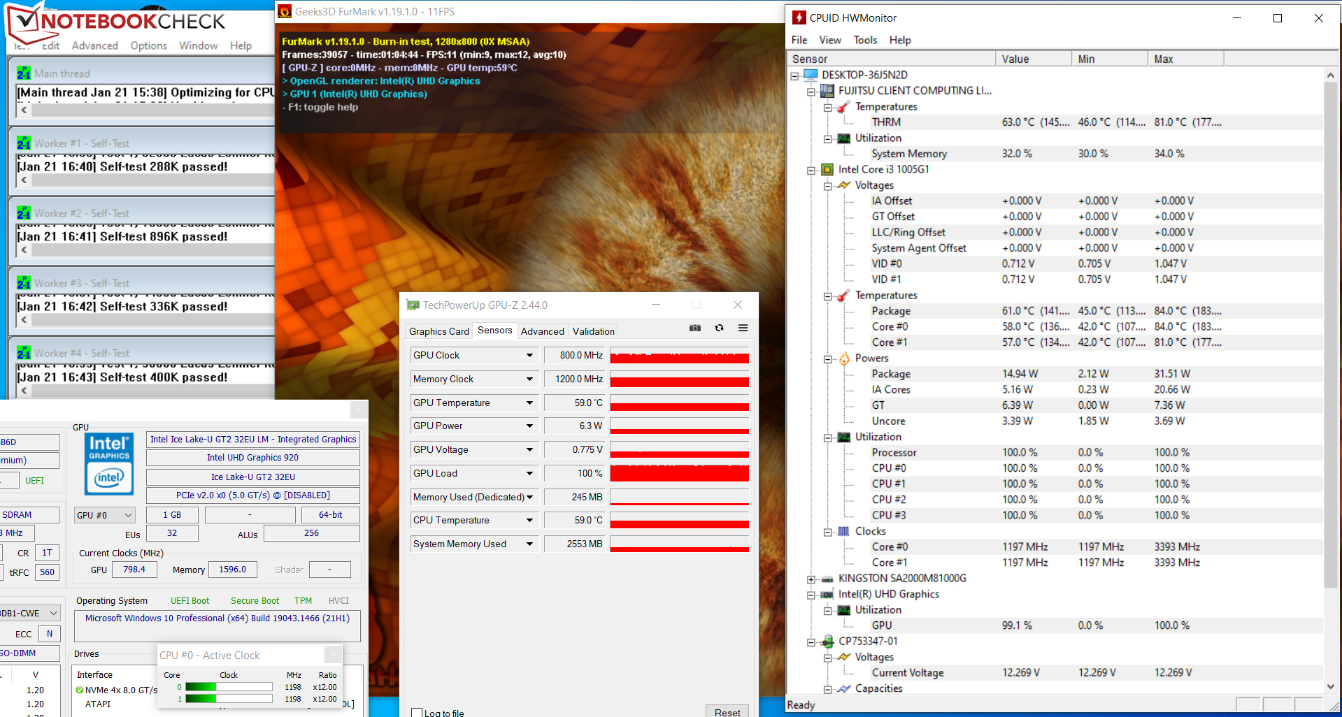 Zu Beginn des Stresstests (Prime95 und Furmark laufen für mindestens eine Stunde) arbeiten CPU bzw. GPU für wenige Sekunden mit 3,4 GHz bzw. 900 MHz. Dann sinken die Taktraten auf 1,2 GHz bzw. 800 MHz und verbleiben auf diesem Niveau.