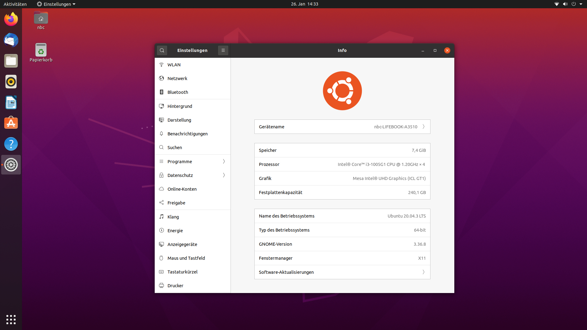 Die uns vorliegende Ausstattungsvariante des A3510 ist auch ohne Windows-Betriebssystem zu bekommen (FPC04902BP, ca. 350 Euro). Hier böte sich Linux als Betriebssystem an. Eine Installation von Ubuntu 20.04.03 LTS (64 Bit) ist problemlos durchführbar. Der Großteil der Hardware wird automatisch eingerichtet - mit Ausnahme einiger Funktionstasten (z.B. Touchpad ein/aus). Die Tasten zur Lautstärke- und Helligkeitsregulierung funktionieren. Gleiches gilt für die Flugzeugmodus-Taste.