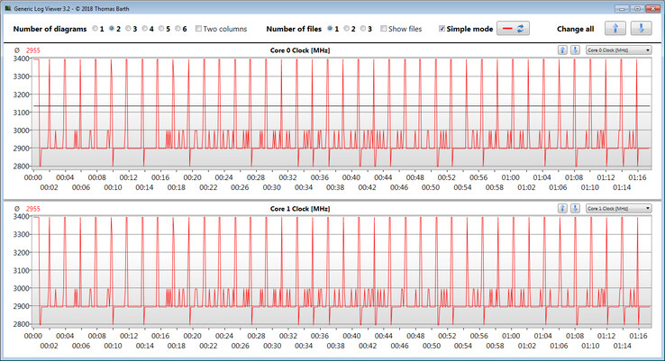 Ob der CPU-Turbo im Netzbetrieb dauerhaft zum Einsatz kommt, überprüfen wir, indem wir den Multi-Thread-Test des Cinebench-R15-Benchmarks für mindestens 30 Minuten in einer Schleife laufen lassen. Der Turbo arbeitet dauerhaft auf hohem Niveau.