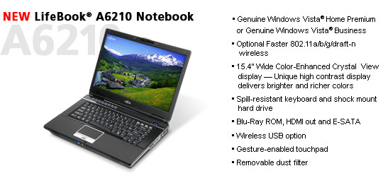 EN→DE Archive.org versionIf you need a notebook suitable for both business and pleasure, the Fujitsu LifeBook A6210 merits serious attention. It has all the features a business user could want (including Centrino 2 performance, a spill-resistant keyboard and shock-resistant hard drive, and plenty of connectivity) plus multimedia features (a gorgeous wide-screen display, a Blu-ray option, and an HDMI port) for life beyond work. The LifeBook A6210 adeptly combines business features with multimedia prowess, making it equally suited for work or play.