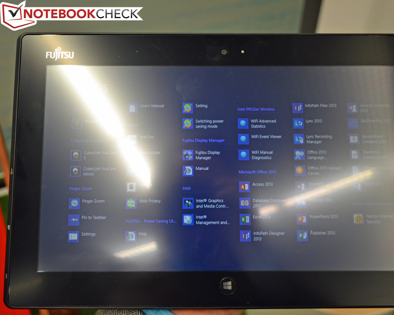 Der 11,6-Zoll-Touchscreen mit IPS-Technik ist matt beschichtet und löst mit 1366x768 Pixeln auf. Fujitsu gibt einen Kontrast von 500:1 und eine Leuchtdichte von 400 cd/m² an. Subjektiv stellt das Display Inhalte scharf und mit leuchtenden Farben dar, hat aber direktem, punktuellen Lichteinfall wenig entgegenzusetzen, wie vereinzelte Spiegelungen in der matten Display-Oberfläche beweisen.