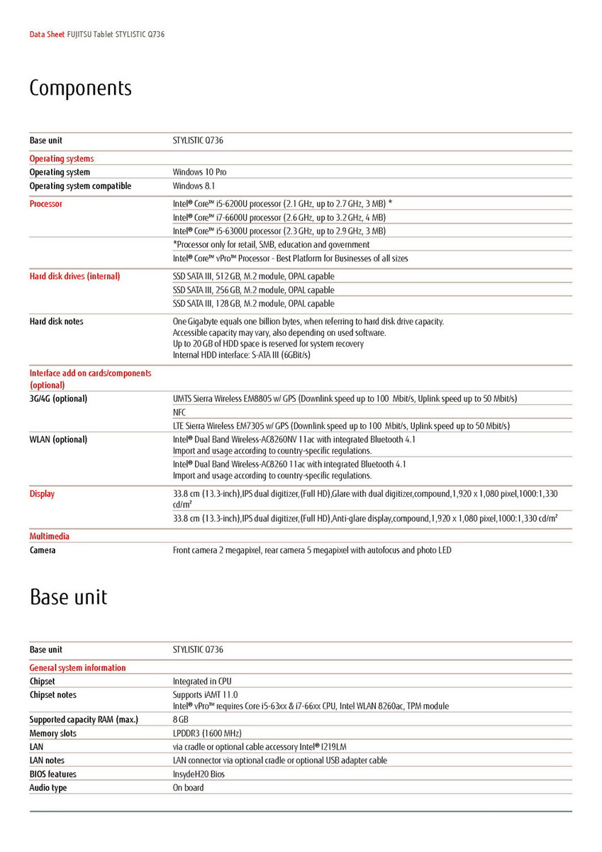 Das neue 13,3-Zoll-Tablet ist jeweils mit Dual-Digitizer und 2 verschiedenen Full-HD-Touchscreens (Anti-glare und Glare) verfügbar. Die Tablet-Einheit kann einfach und schnell mit einer abnehmbaren Tastatur verbunden werden und verwandelt sich so in ein klassisches Notebook. Das Stylistic Q736 bringt es auf ein Gewicht von unter 1 Kilo und ist je nach Modell mit Intel vPro-Prozessoren der 6. Generation mit Codenamen Skylake erhältlich. Zur Auswahl stehen Intels Core i5-6200U, Core i5-6300U sowie Core i7-6600U.