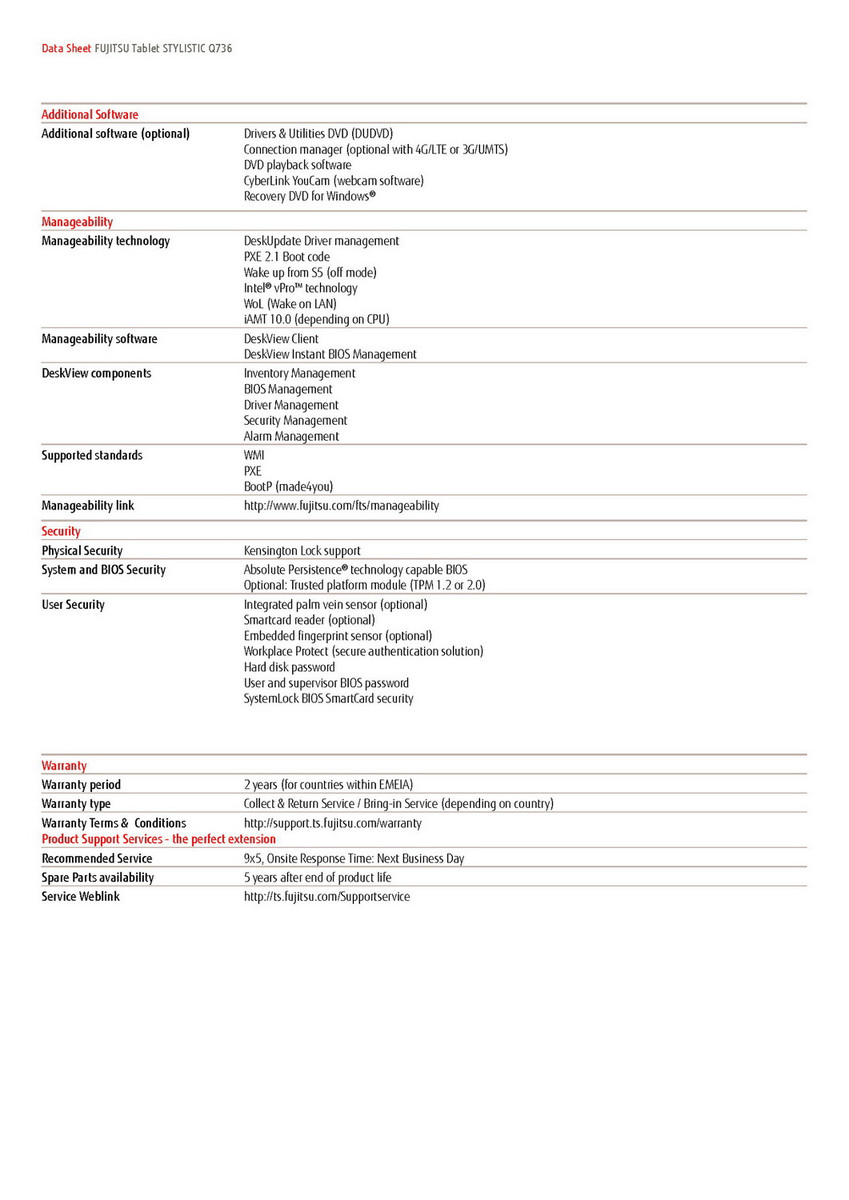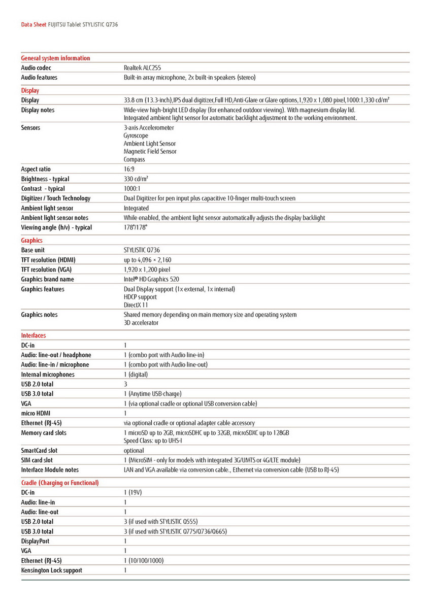 Laut Fujitsu sind Sicherheitsauthentifizierungen biometrisch oder über die SmartCard-Technologie möglich. Zudem kann die auf NFC-Technologie basierende kontaktlose SmartCard unterstützt werden. Das Fujitsu Stylistic Q736 enthält ein verschlüsselbares SSD-Laufwerk sowie das Trusted-Platform-Module (TPM) von Intel. Zudem verfügt das Stylistic Q736 über verschiedenene Verbindungsoptionen, inklusive 4G/LTE-Kommunikation und integriertes GPS.