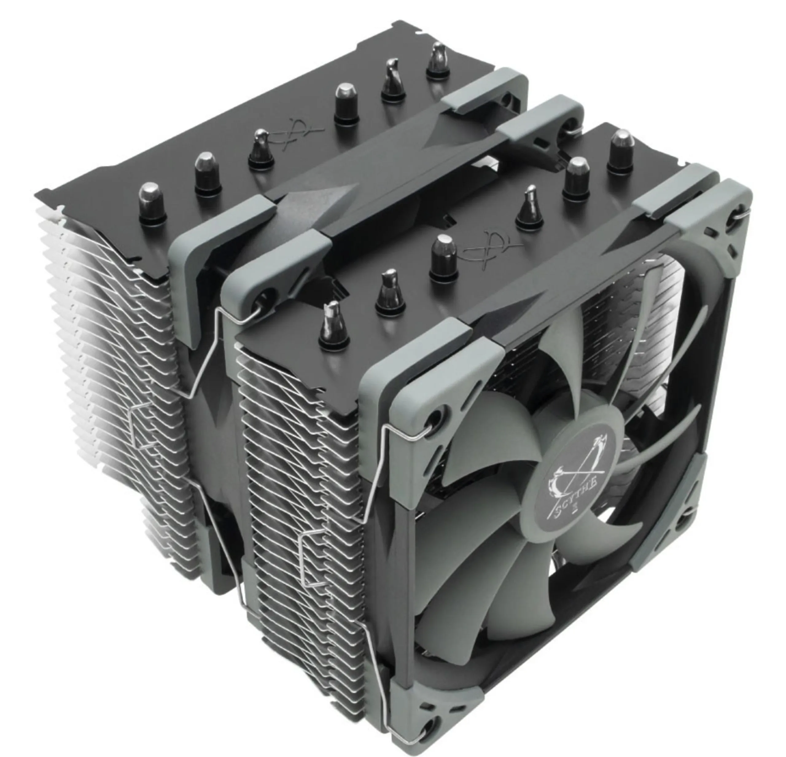 Die Abwärme der CPU erhalten die Kühlfinnen in den beiden Türmen von insgesamt sechs 6-mm-Heatpipes, wobei der Hersteller auf eine klassische Bodenplatte und nicht den direkten Kontakt der Heatpipes mit dem Heatspreader der CPU verzichtet.