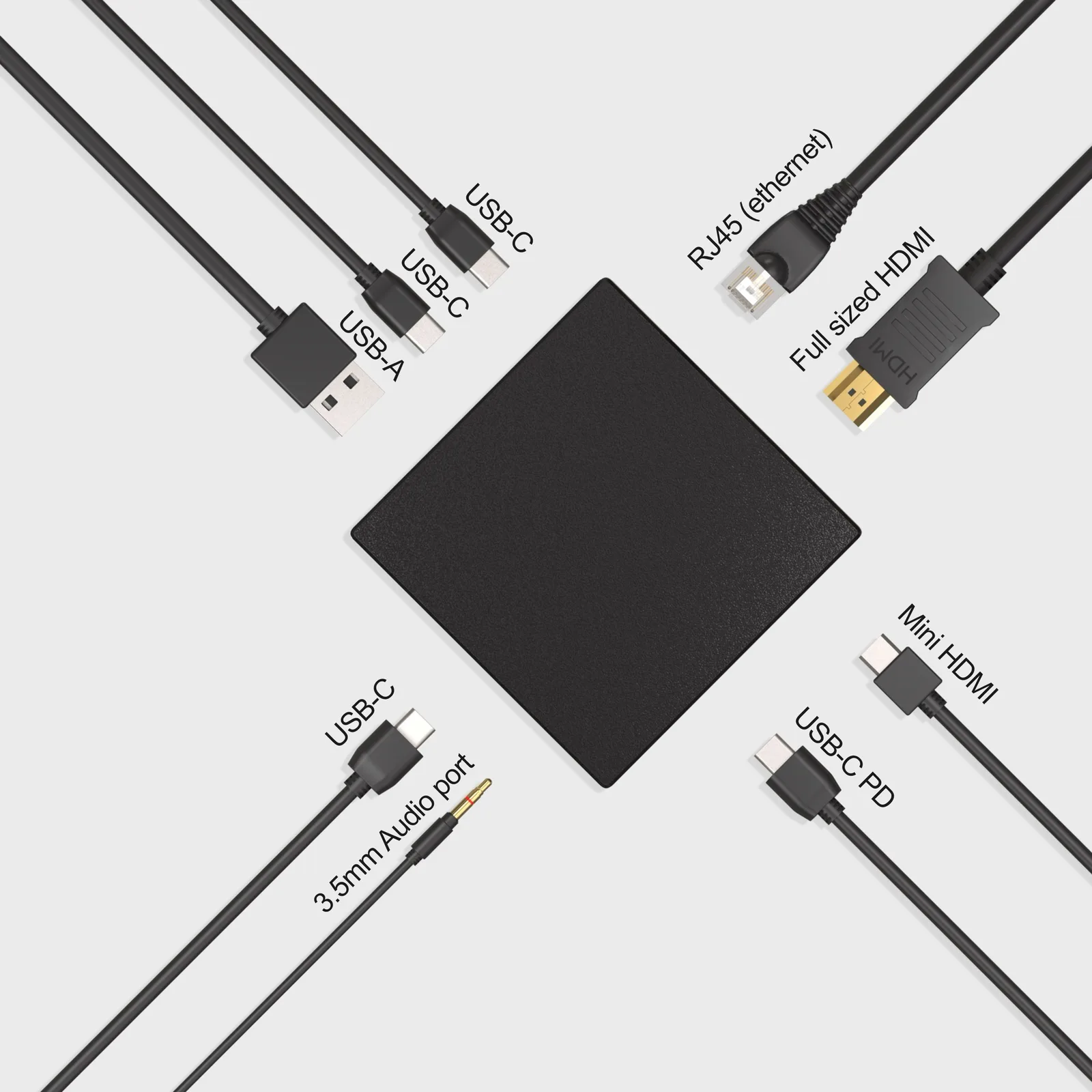 Die Vorderseite beherbergt einen 3,5 mm Kopfhöreranschluss, an der rechten Seite befindet sich ein USB-C-Port mit Unterstützung für Power Delivery, sodass an diesem Port ein Ladegerät angeschlossen werden kann. Zum Anschließen von Zubehör bietet der Convergence Hub zwei weitere USB-C-Anschlüsse sowie einen USB-A-Port. Ethernet erlaubt eine verkabelte Netzwerk-Verbindung, während durch HDMI und Mini-HDMI externe Monitore angeschlossen werden können. Durch einen Synaptics DL-6950 DisplayLink-Chip werden theoretisch 4K-Monitore mit einer Bildfrequenz von 60 Hz unterstützt.
