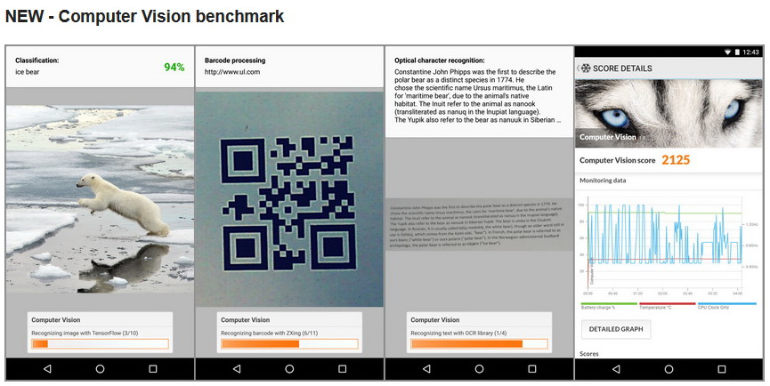 Mit dem Computer Vision Benchmark überprüft die Benchmark-App von Futuremark auf Basis von gebräuchlichen Programmbibliotheken wie TensorFlow von Google, ZXing oder Tesseract die Leistung für die Bereiche Bilderkennung, dem Scannen von Barcodes und der optischen Zeichen- respektive Texterkennung. Die Performance lässt sich dann plattformübergreifend auf Geräten mit unterschiedlichen Betriebssystemen vergleichen.