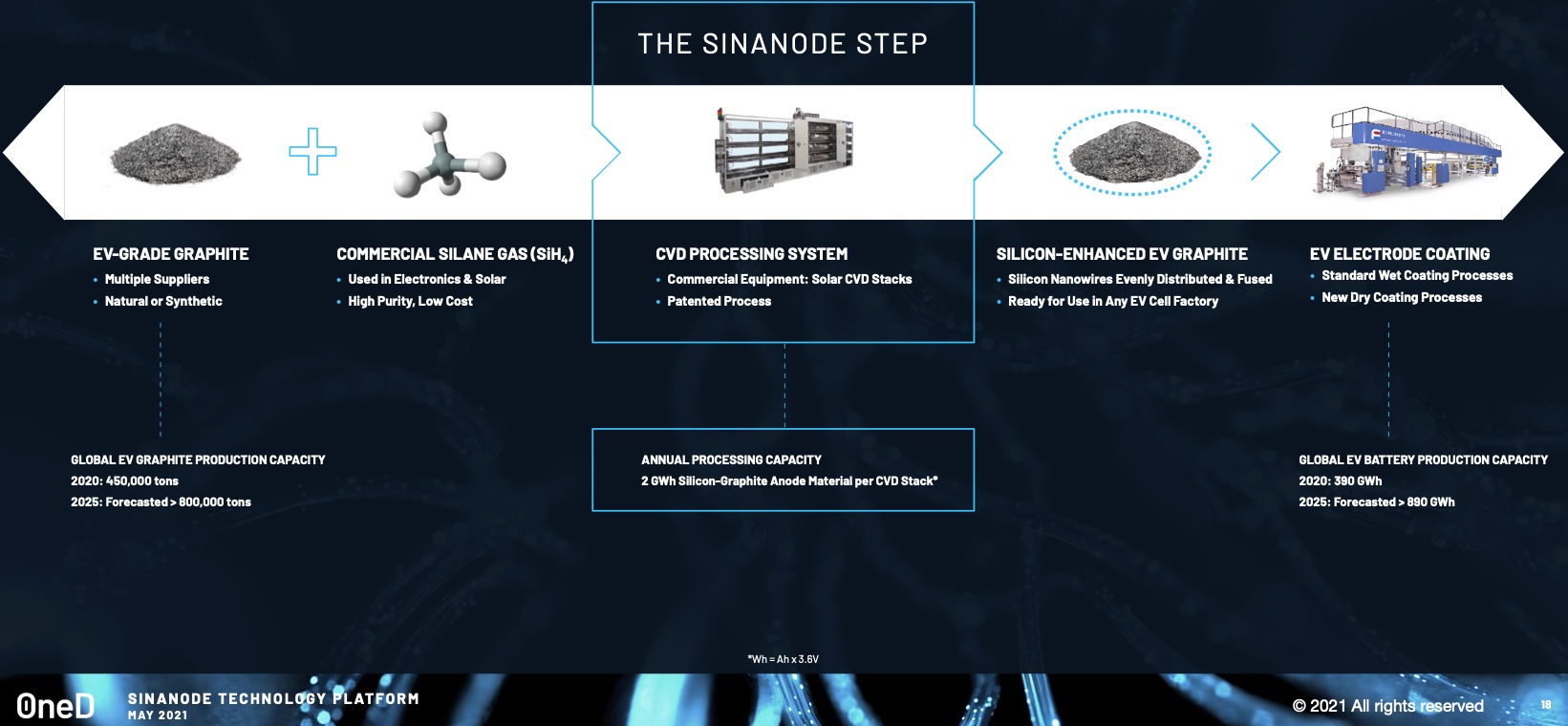 Im Mittelpunkt der Zusammenarbeit steht die Sinanode-Plattform von OneD als Fertigungstechnologie, die sich nahtlos in bestehende Produktionsprozesse einfügt, um Silizium-Nanodrähte auf handelsübliches Graphitpulver aufzuschmelzen, wodurch die Energiedichte der Anode verdreifacht und die Kosten pro kWh halbiert werden. Silizium könne 10-mal mehr Energie speichern als Graphit, so OneD.