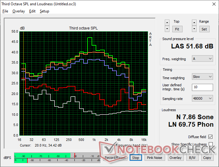 Die Lüfter sind immer aktiv, unabhängig von der Bildschirmauslastung. Sie sind zwar nicht sehr laut, aber selbst bei geringer Last wie Webbrowsing oder Videostreaming ist ein konstantes Surren zu hören. Bei höherer Belastung wie Spielen kann das Lüftergeräusch auf bis zu 50 dB(A) ansteigen und ist damit lauter als bei den meisten ultradünnen Laptops.