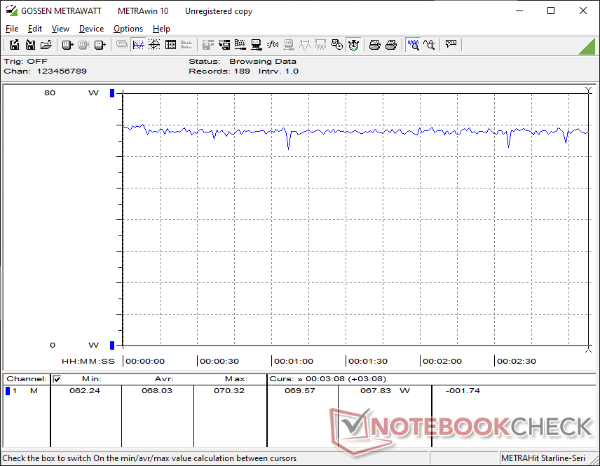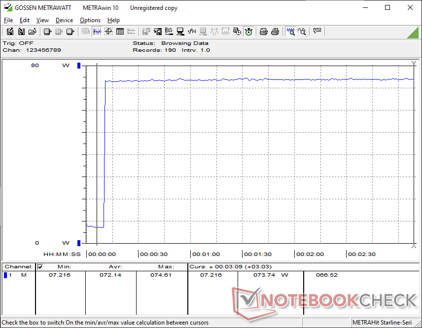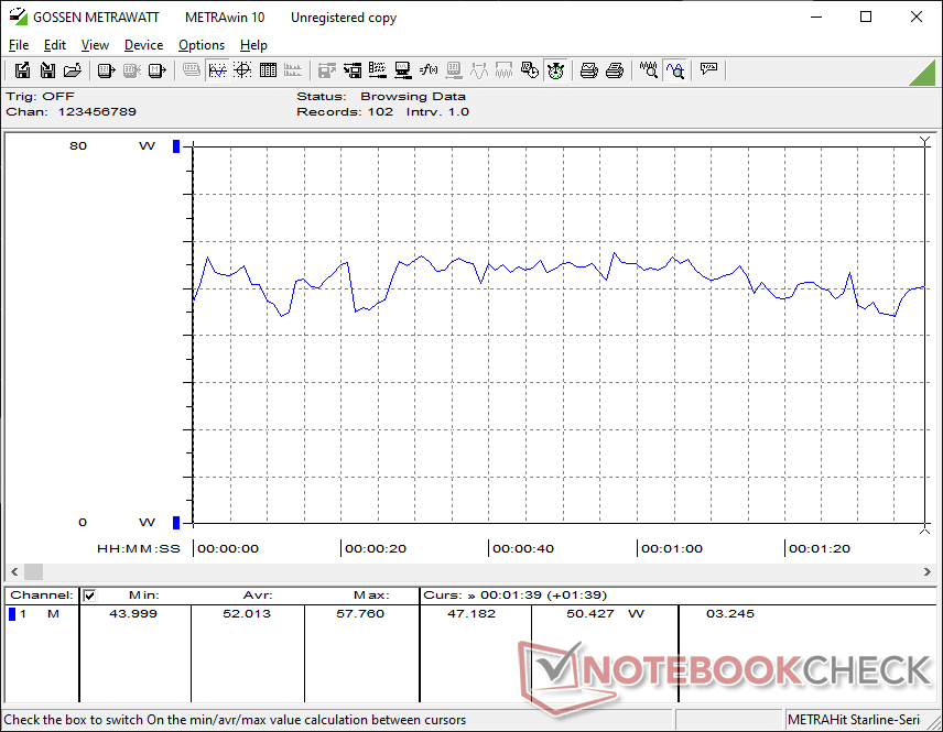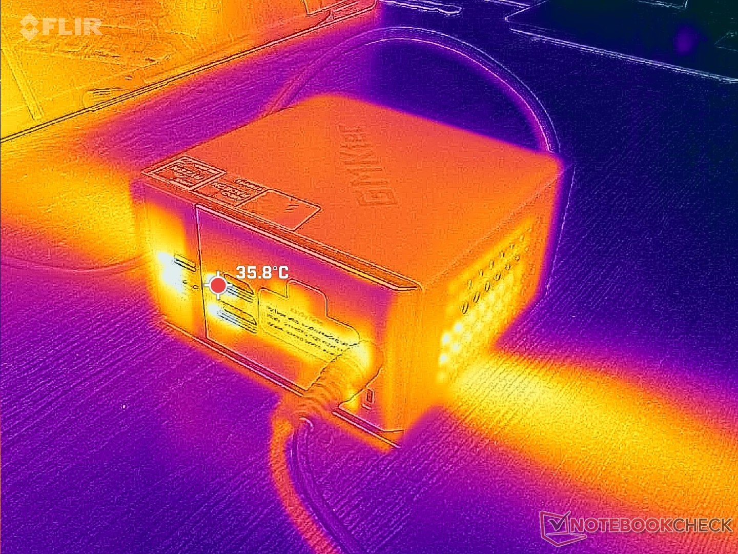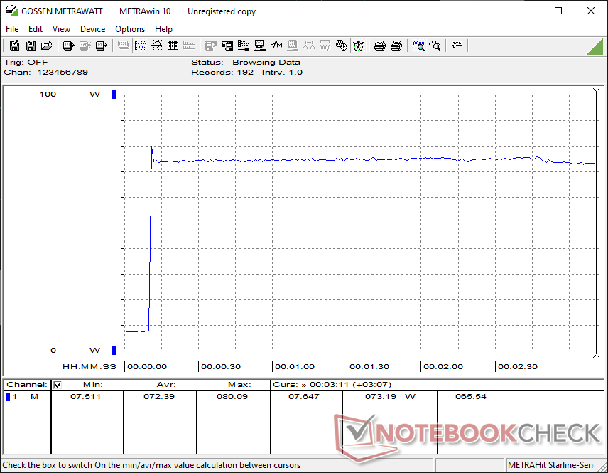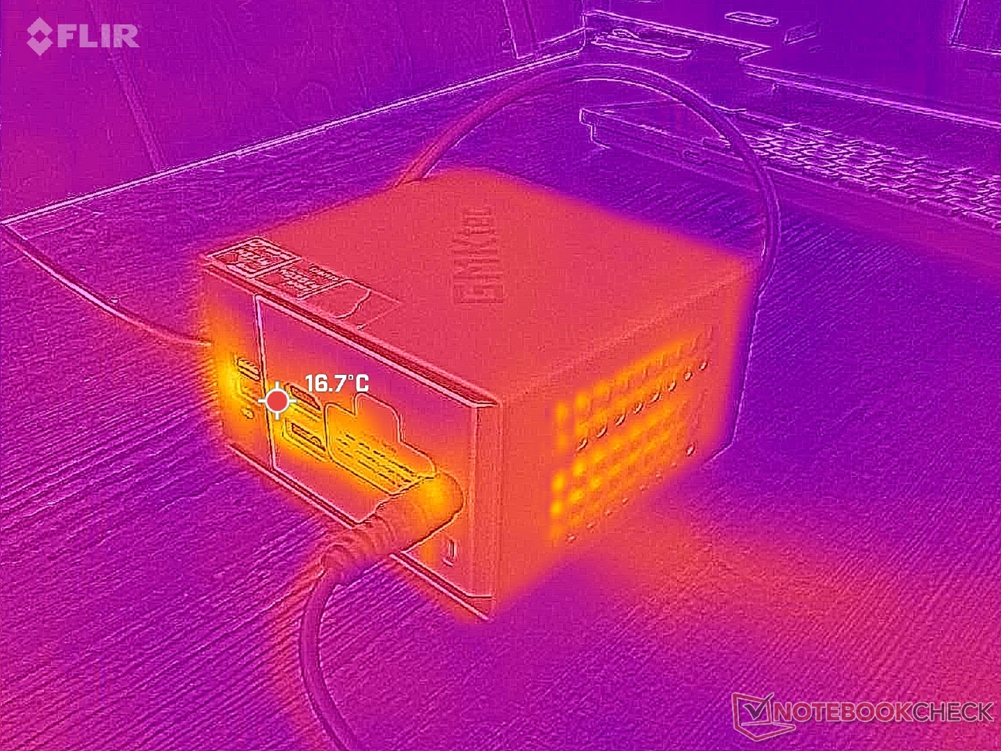 Wir konnten eine maximale Leistungsaufnahme von 80 W aus dem mittelgroßen (~13,3 x 5,8 x 3,2 cm) 120-W-Netzteil messen.