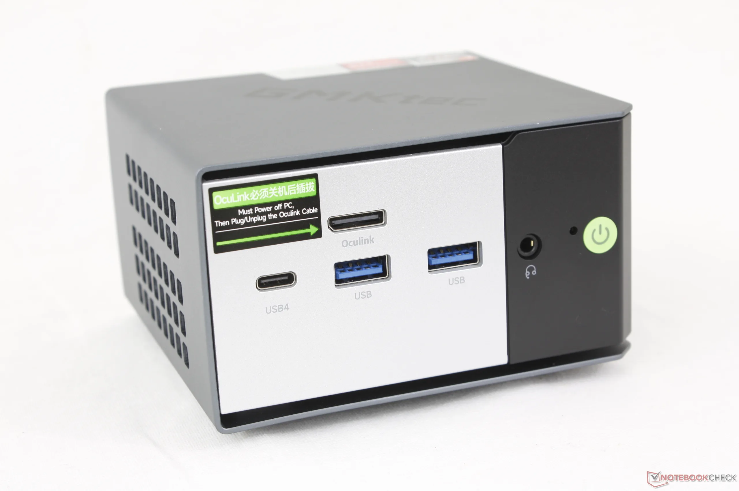 Das Gehäuse ist identisch mit dem EVO-X1 aus dem letzten Jahr, der nach wie vor einer der kleinsten Mini-PCs in GMKtecs Produktpalette ist. Die Anschlussoptionen haben sich nicht geändert, einschließlich des wichtigen Oculink Anschlusses, der das Modell von den meisten konkurrierenden Mini-PCs unterscheidet.