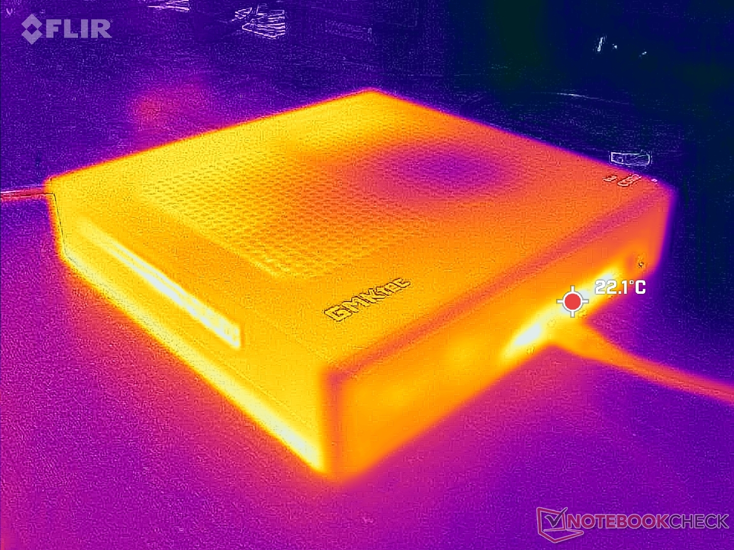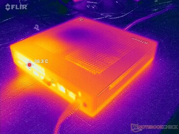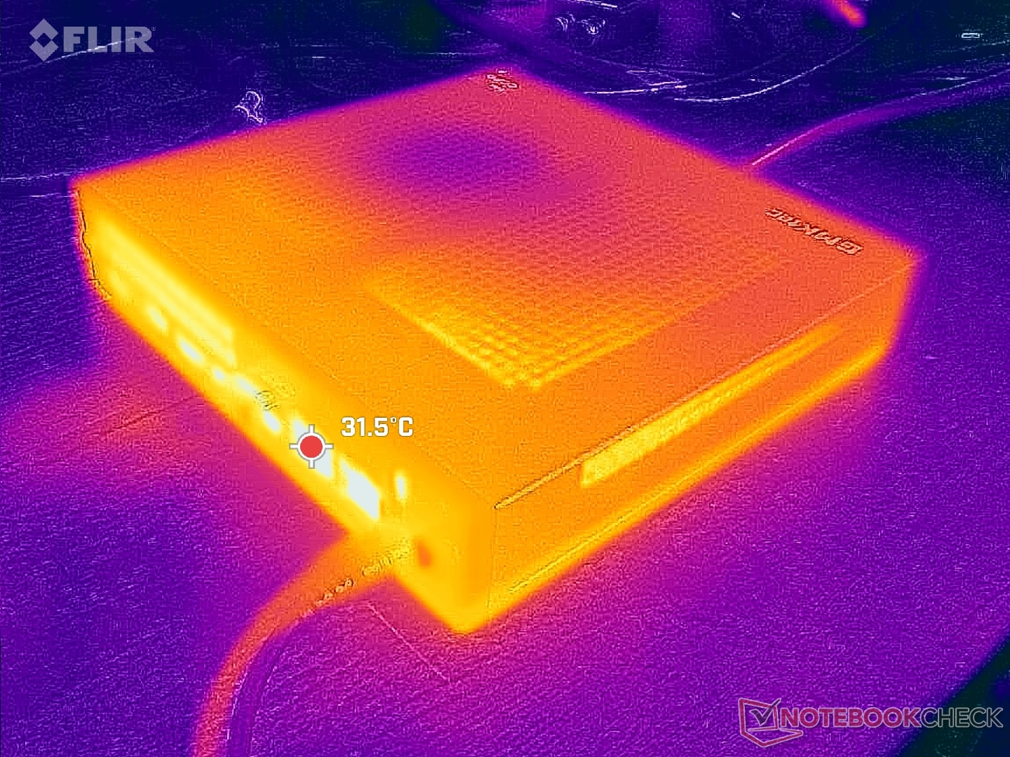 Die Oberflächentemperaturen sind aufgrund der relativ großen Stellfläche und des Metallgehäuses nie unangenehm warm. Die Frischluft strömt von oben ein, während die Abwärme von der Rückseite abgegeben wird. Daher wird nicht empfohlen, Gegenstände wie Bücher oder Papier auf das Gerät zu legen.