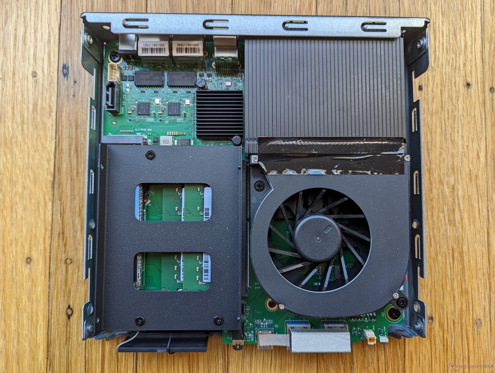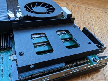 Die obere Abdeckung kann entfernt werden, nachdem zwei Schrauben auf der Rückseite gelöst wurden. Dahinter offenbaren sich zwei Speicherschächte (2,5-Zoll-SATA III + M.2 2280) sowie zwei SODIMM-Slots. Upgrades gestalten sich relativ unkompliziert und erfordern lediglich einen Schraubenzieher.