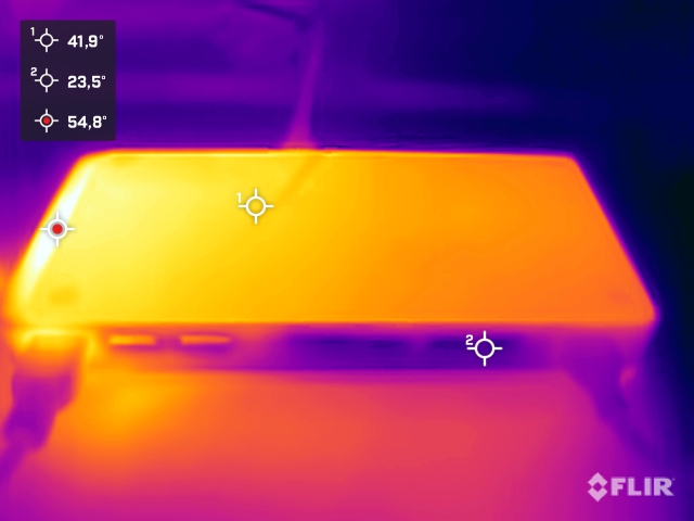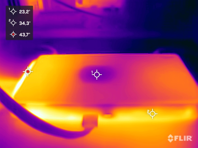 GPD verbaut mittig einen Lüfter, welcher seitlich und an der Oberseite Luft ansaugen kann. Grundsätzlich ist das Konzept gut und durchdacht. Allerdings ist die Lautstärke des Lüfters im Betrieb nicht zu überhören. Schon im Leerlauf notieren wir 36 dB(A). Beim Stresstest erreichte die eGPU dann sogar 55,7 dB(A), was schon als störend bezeichnet werden kann. Wer hier nicht mit einem guten Headset ausgestattet ist, wird die Grafikkarte immer im Hintergrund wahrnehmen. Aufgrund der relativ hohen Frequenz, die der Lüfter erzeugt, wirkt die Lautstärke subjektiv noch lauter. Hier hätten wir uns eine deutlich effektivere Kühlmethode gewünscht. Vielleicht wäre ein externes Netzteil eine bessere Alternative gewesen, denn dann wäre im Gehäuse mehr Platz, um einen größeren Kühler unterzubringen.
