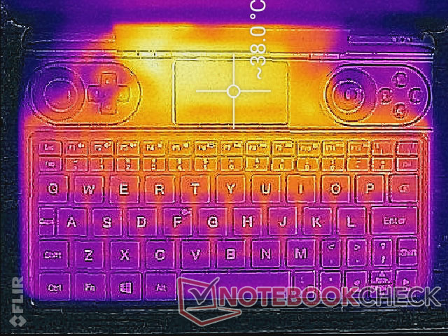 (+) Die maximale Temperatur auf der Oberseite ist 38 °C. Im Vergleich liegt der Klassendurchschnitt bei 37.9 °C (von 26.6 bis 55 °C für die Klasse Handheld / UMPC).
