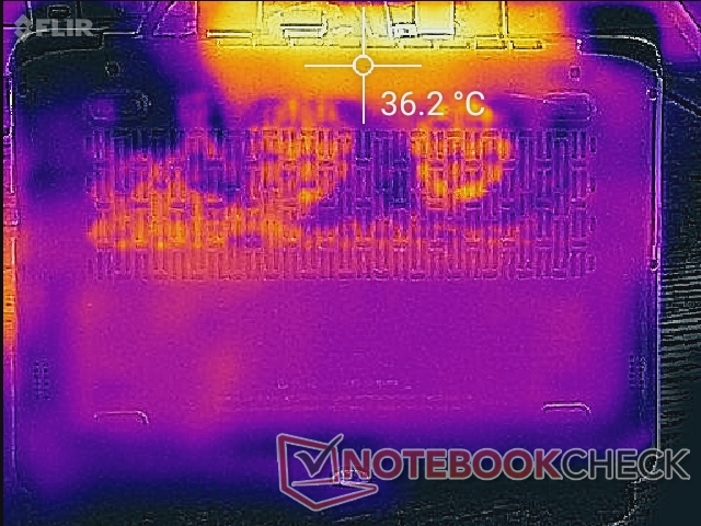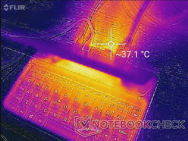 Bei aktivem Turbo-Lüftermodus wird das Clickpad beim Spielen nur etwa 38 °C heiß. Wichtige Bereiche, wie die Tastatur und die Controllertasten in der Nähe der hinteren Ecken, bleiben für den Komfort kühler. Die Oberflächentemperaturen werden etwas wärmer, wenn der Turbolüfter deaktiviert ist.