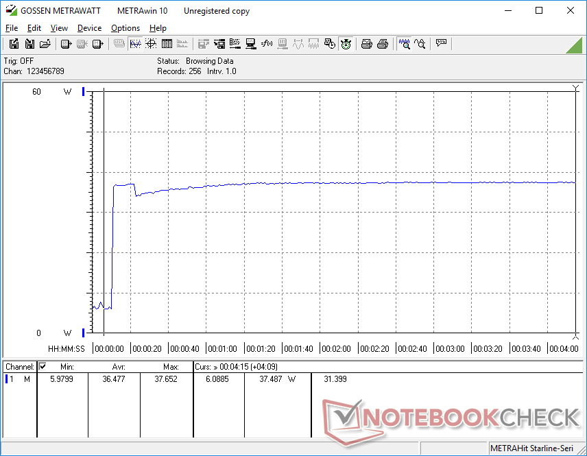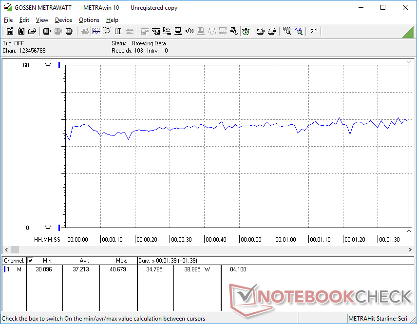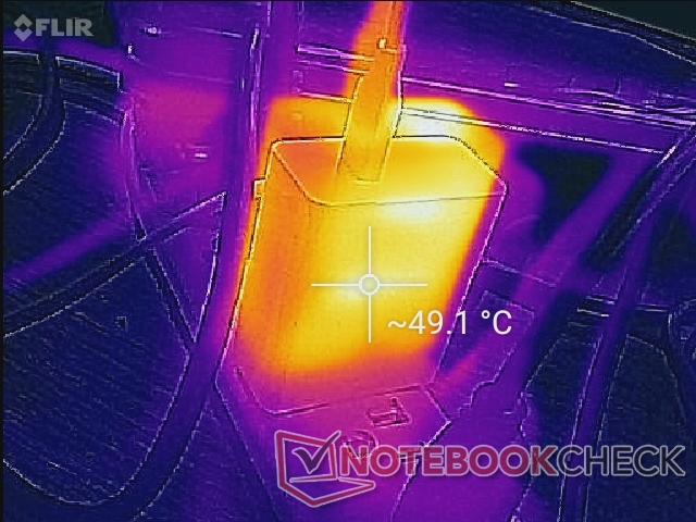 Im Leerlauf verbraucht unser Testgerät zwischen 5 W und 8 W, je nach Helligkeitsstufe und Energieprofil. Beim Spielen verbraucht das kleine (~6,4 x 5,5 x 2,8 cm) 65-W-USB-C-Netzteil etwa 37 W.