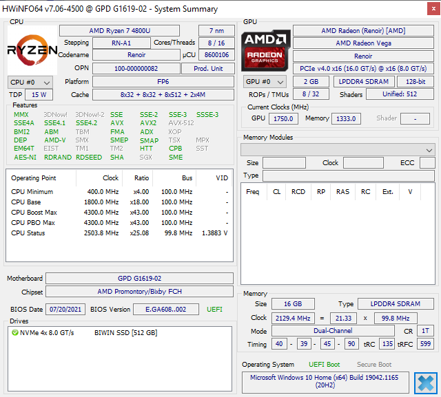 Das GPD Win Max wurde Ende letzten Jahres mit der 10. Generation von Intel Ice Lake eingeführt. 2021 hat der Hersteller das Modell mit neueren und schnelleren CPUs der 11. Tiger-Lake-Generation und Zen-2-Optionen für AMD-Fans aufgefrischt. Unser Testgerät kommt mit dem Ryzen 7 4800U und integrierter Radeon RX Vega 8 GPU. Obwohl AMD inzwischen die mobilen Zen-3-CPUs wie den Ryzen 7 5800U entwickelt hat, ist der ältere Ryzen 7 4800U immer noch eine der schnellsten CPUs der U-Serie.