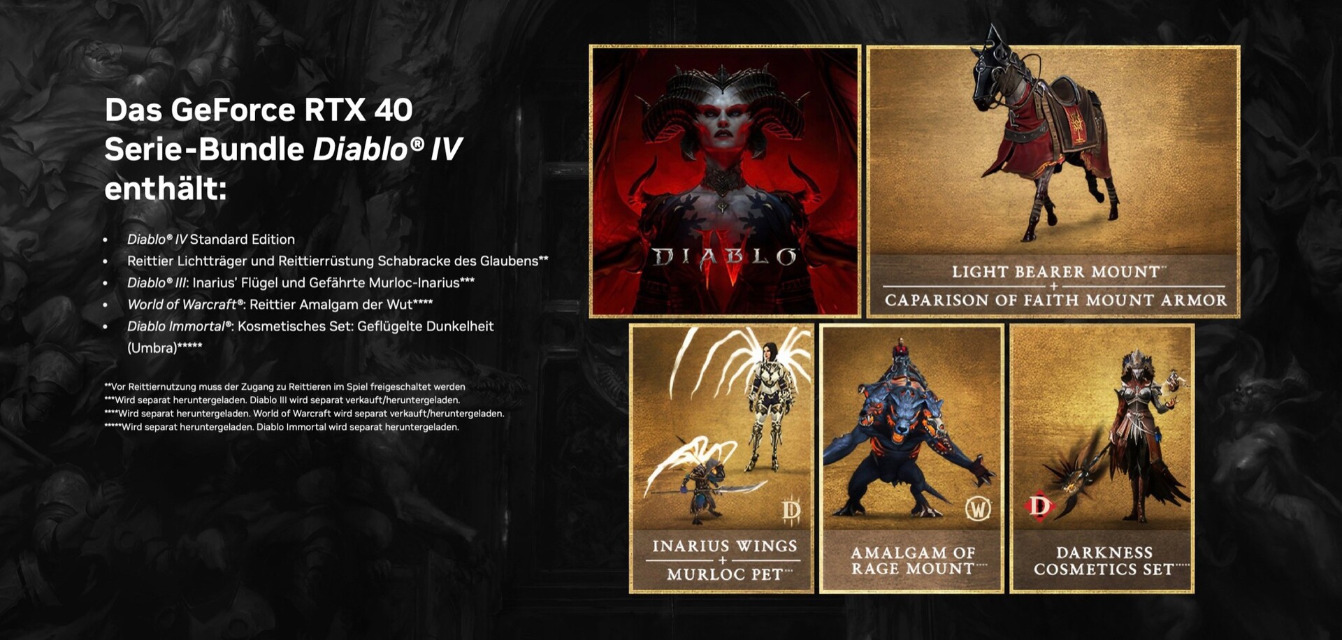Die neueste Aktion von Nvidia erlaubt es Kunden, Diablo IV kostenlos herunterzuladen, solange diese zwischen 9. Mai und 13. Juni eine GeForce RTX 4000 Desktop-Grafikkarte oder einen PC mit einer entsprechenden GPU kaufen. Folgende Grafikkarten sind für diese Aktion berechtigt: