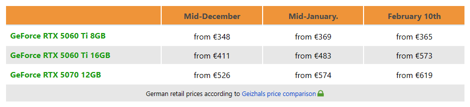 Der Preis der RTX 5060 Ti mit 16GB ist in den vergangenen Monaten beispielsweise auf 573 Euro explodiert. Damit rückt die GPU preislich deutlich näher an die RTX 5070 heran, die derzeit bei etwa 619 Euro liegt. Die RTX 5060 Ti mit 8GB ist zwar aktuell ebenfalls um 17 Euro teurer als Mitte Dezember 2025, jedoch bei weitem nicht so stark gestiegen wie die RTX 5060 Ti 16GB und die RTX 5070.