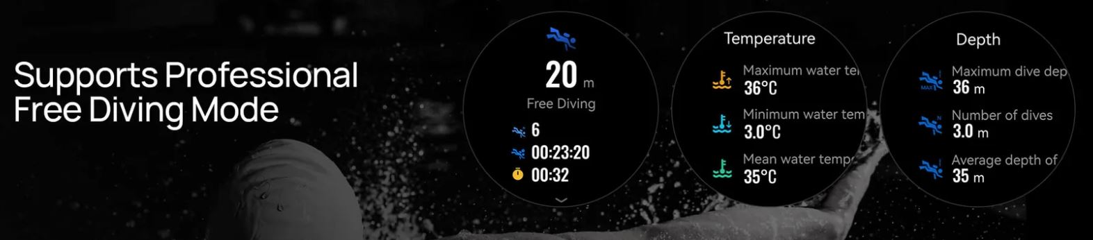 Das AMOLED wird von Corning Gorilla Glass geschützt und löst mit 466 x 466 Pixeln auf, die maximale Helligkeit wird mit 1.500 cd/m² angegeben. Herstellerangaben zufolge lassen sich die Herzfrequenz und die Sauerstoffsättigung des Bluts einfach messen. Typische Smartwatch-Funktionen wie die Anzeige von Benachrichtigungen und der Wettervorhersage sind vorhanden. Beworben wird eine maximale Laufzeit von bis zu 20 Tagen im Smartwatch-Modus.