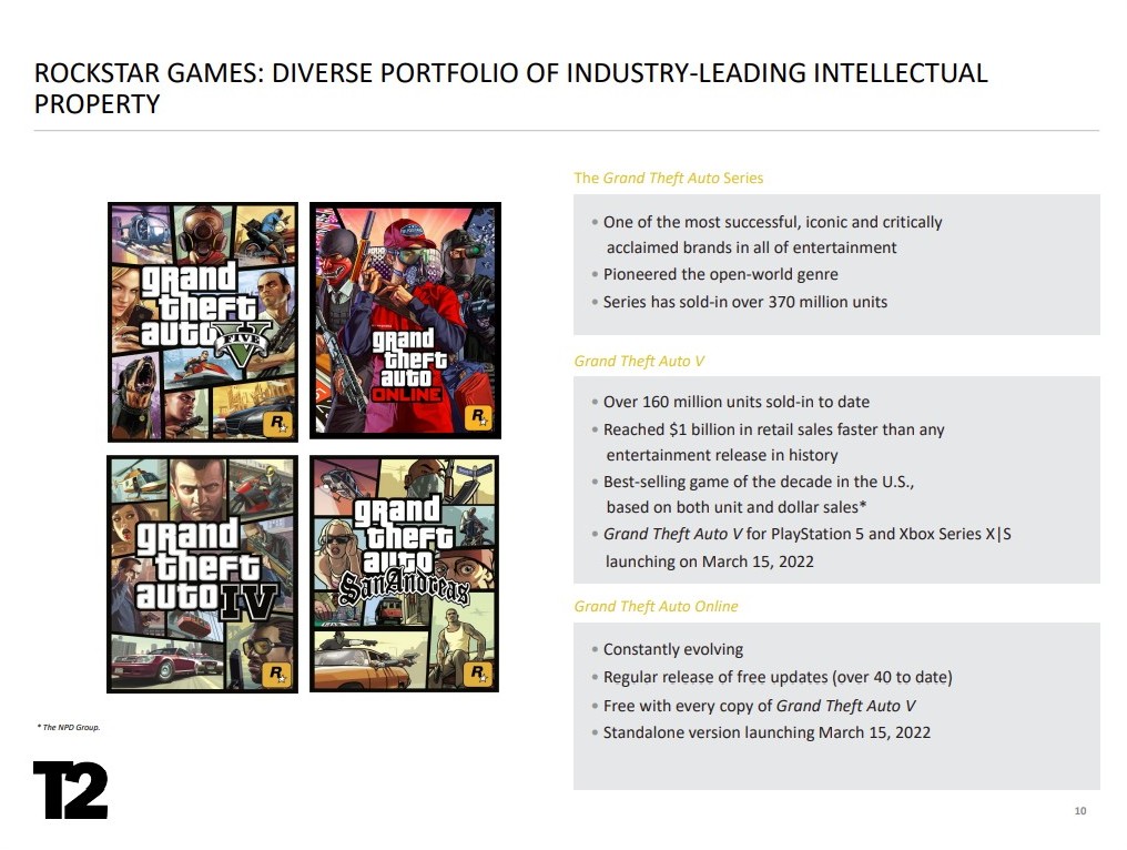 Grand Theft Auto V (GTA 5) hat laut Take-Two Interactive weitere Rekorde aufgestellt. So sei GTA 5 das erste Spiel, das in nur 3 Tagen nach dem offiziellen Start im September 2013 über eine Milliarde US-Dollar eingespielt habe. Zudem ist Grand Theft Auto V das meistverkaufte Spiel des Jahrzehnts in den USA, gemessen an den verkauften Einheiten und generiertem Umsatz. Insgesamt wurden von der Grand Theft Auto Series weltweit über 370 Millionen Spiele verkauft.