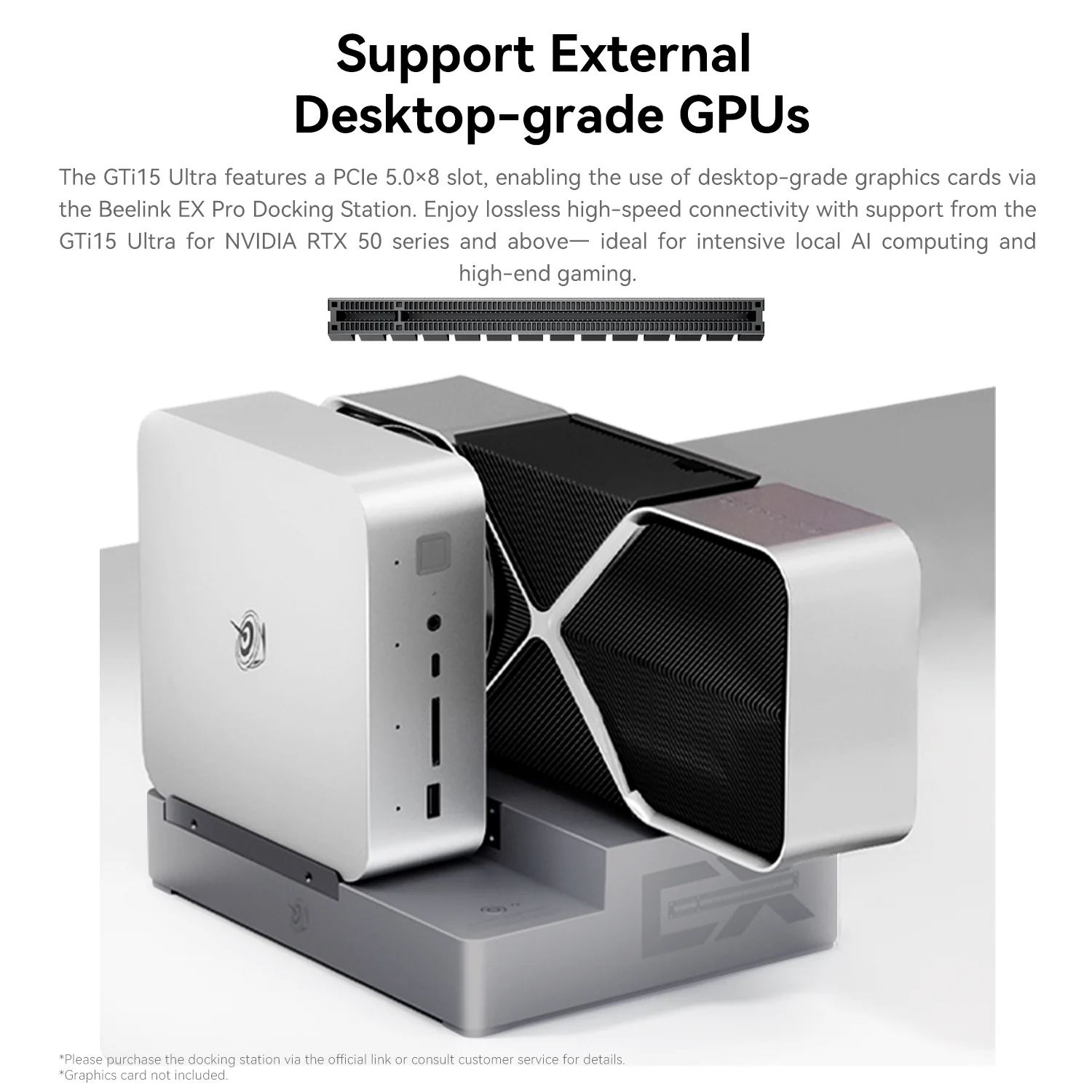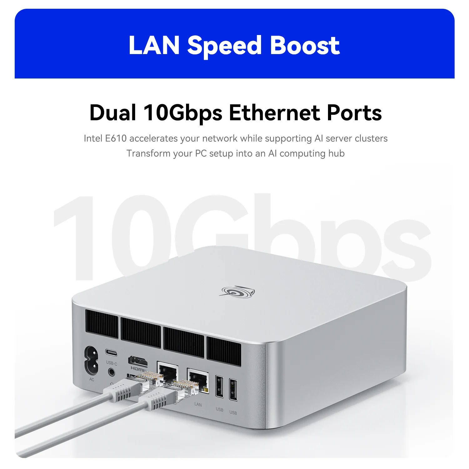Besonderen Fokus legt Beelink auch auf die Nutzung mit einer externen Grafikkarte. So kann der Mini-PC in eine Docking-Station eingesteckt werden, dann erfolgt die Datenübertragung über acht PCIe 5.0-Lanes und damit im Vergleich etwa zur Nutzung mit einer OCuLink-Verbindung wesentlich höherer Datenübertragungsrate. Der Beelink GTi15 Ultra selbst kommt mit dem Intel Core Ultra 9 285H. Die Ausstattung ist umfangreich: So gibt es an der Rückseite gleich zweimal Ethernet mit einer maximalen Datenübertragungsrate von 10 GBit/s, dazu kommen auf der Rückseite auch noch zweimal USB 3.2 mit einer maximalen Datenübertragungsrate von ebenfalls 10 GBit/s. USB Typ C mit 40 GBit/s steht ebenso bereit, dazu kommen noch einmal HDMI und DisplayPort 1.4a. Der an der Vorderseite montierte USB Typ C-Port unterstützt nur 10 GBit/s, dazu kommen noch ein SD-Speicherkartenleser, USB 3.2 und eine 3,5-Millimeter-Klinkenbuchse. In den Anschalter ist ein Fingerabdrucksensor integriert. Die vier Löcher an der Frontseite sind für die vier Mikrofone vorhanden.