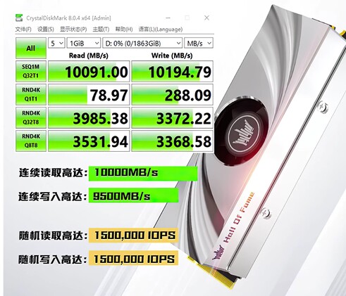 Die Galax HOF Extreme 50 SSD soll dank Anbindung über PCIe 5.0 eine extreme Performance erreichen. Das Topmodell mit 2 TB Speicher liest mit 10 GB/s bzw. 1,5 Millionen IOPS, die Schreib-Geschwindigkeit wird mit 9,5 GB/s respektive 1,5 Millionen IOPS spezifiziert.