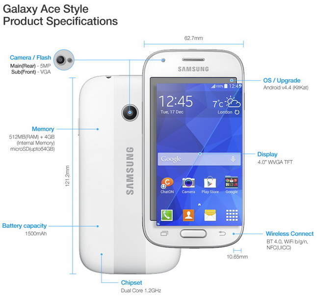 Für Fotos und Videos steht an der Rückseite des Galaxy Ace Style ein 5-MPixel-Modul ohne Blitz und vorne eine einfache 0,3-MP-Cam (VGA) für Selfies und Videochats zur Verfügung. Als Akku spendiert Samsung seinem 121,2 x 62,7 x 10,6 Millimeter messenden Galaxy Ace Style eine 1500-mAh-Batterie. Das Galaxy Ace Style ist in dunklem Grau (Dark Gray) und Weiß (Cream White) verfügbar. Ab Werk läuft auf dem Budget-Phone die abgespeckte TouchWiz-Oberfläche "TouchWiz Essence" von Samsung.