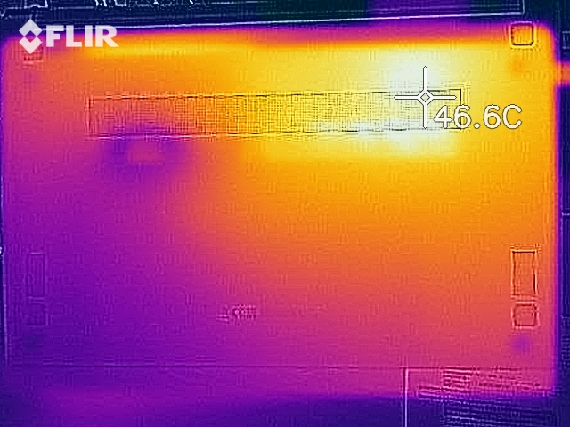 (-) Die maximale Temperatur auf der Oberseite ist 46.5 °C. Im Vergleich liegt der Klassendurchschnitt bei 34.3 °C (von 21.2 bis 62.5 °C für die Klasse Office).